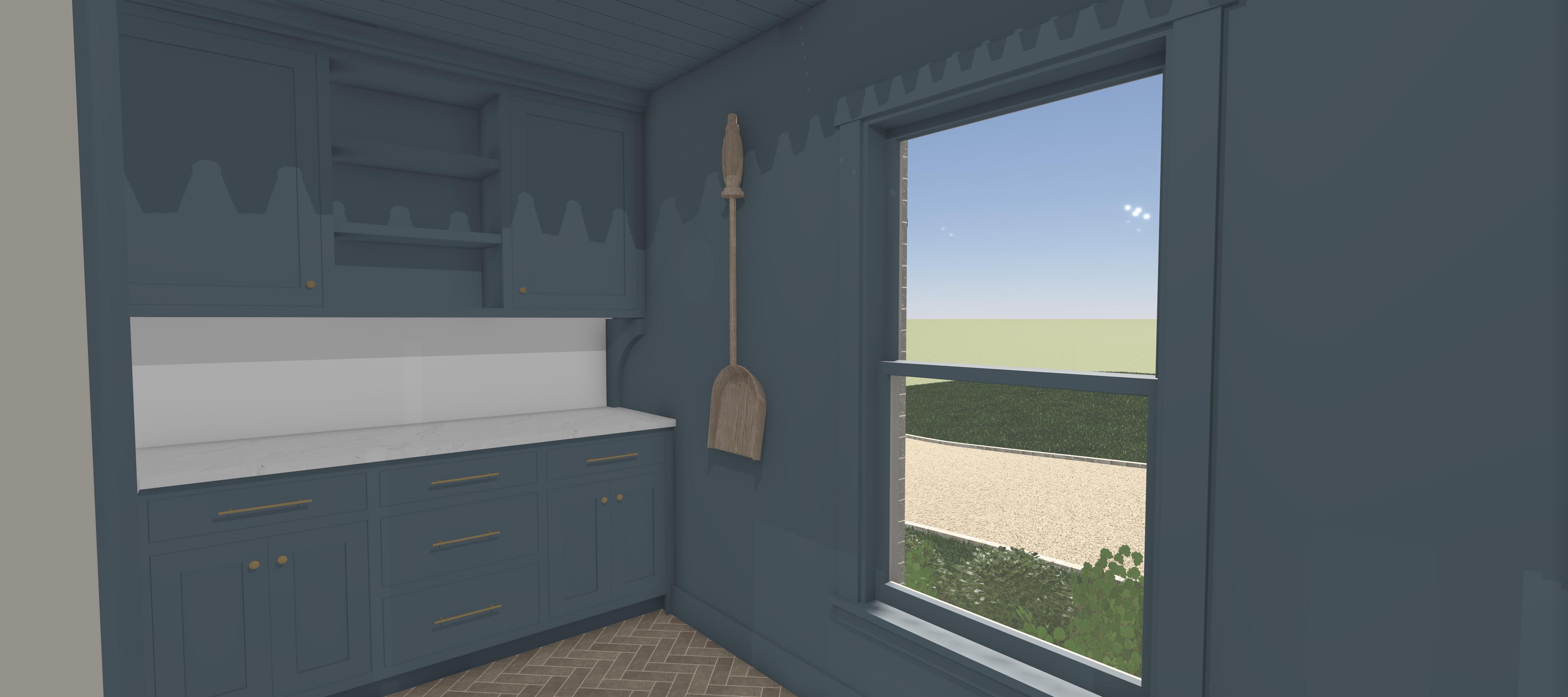 create a realistic rendering with dramatic natural light streaming through the window and the walls and cabinetry a smoky dusty blue