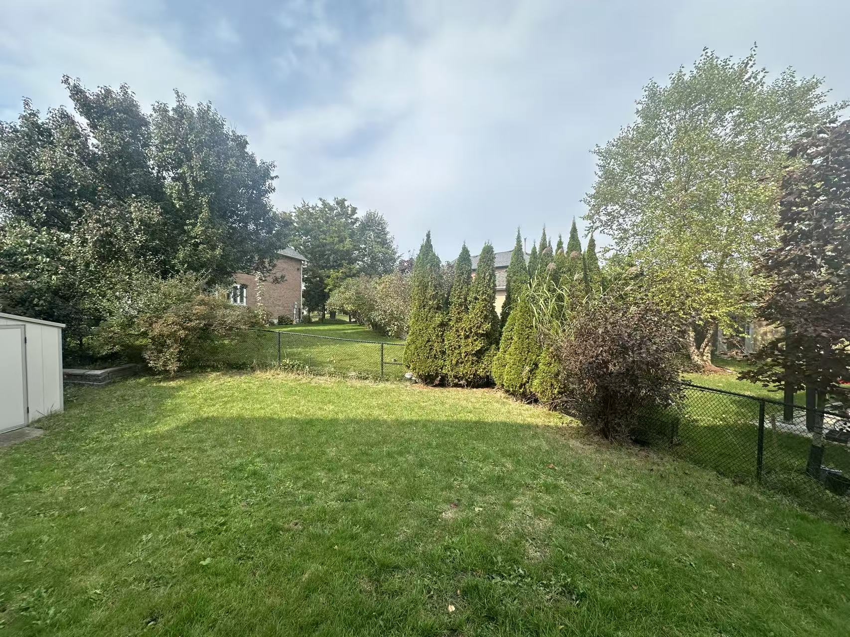 transform this backyard into a modern artistic landscape design suitable for toronto climate add a row of tall 10 12 feet cedar trees along the fence line to create a natural privacy screen introduce a japanese maple tree with light red foliage as a focal point add seasonal flowering plants in soft pink and purple tones such as hydrangeas lilacs and lavender to bring variety beyond green design the lawn with clean edges and integrate low maintenance shrubs for balance install subtle landscape lighting along the pathway under the cedar trees and to highlight the japanese maple creating a warm evening atmosphere the overall style should be artistic contemporary and harmonious with nature while ensuring privacy and visual interest