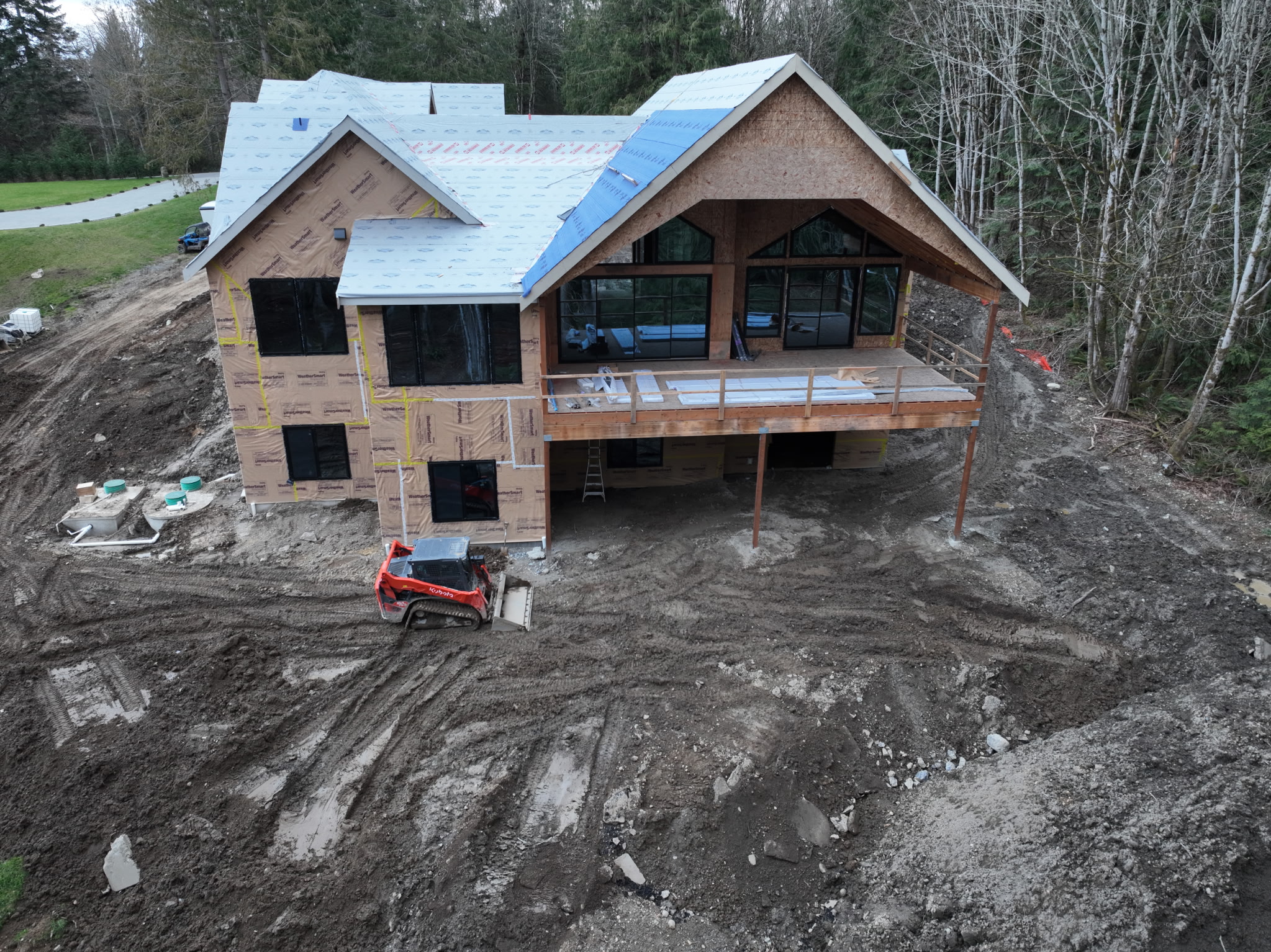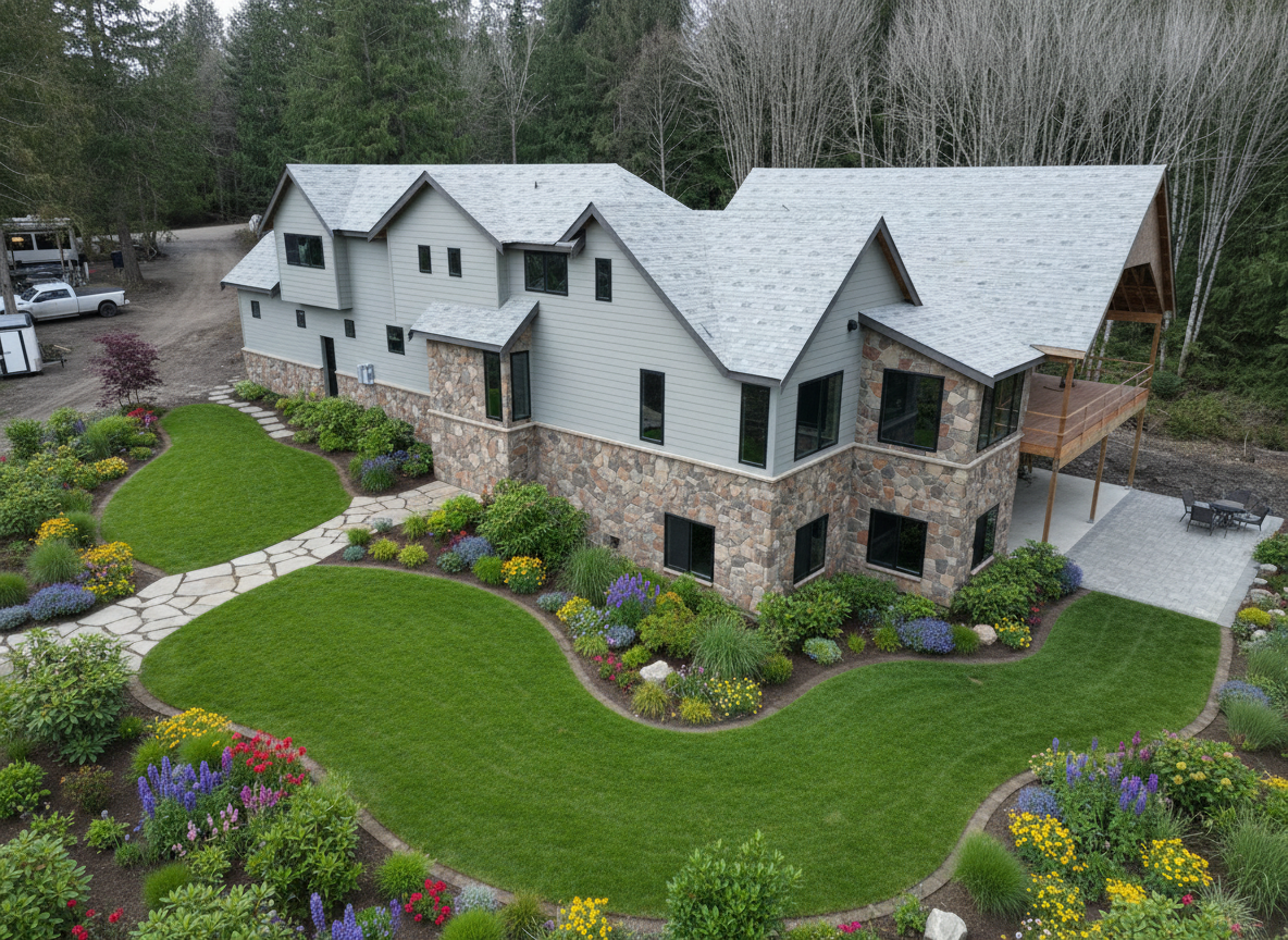 a manicured lawn layered flower beds low maintenance shrubs native plants stone pathway leading to the entrance and finish the house with stonework dark beige siding and paneling for accents finish the driveway along the left side finish the deck with paneling and railings