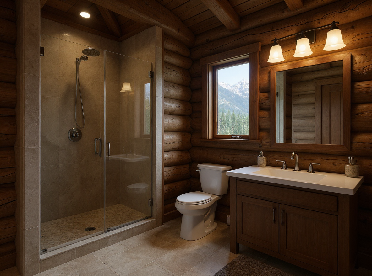 rendering this bathroom two shower heads dual sink vanity no log walls no windows toilet between shower and vanity