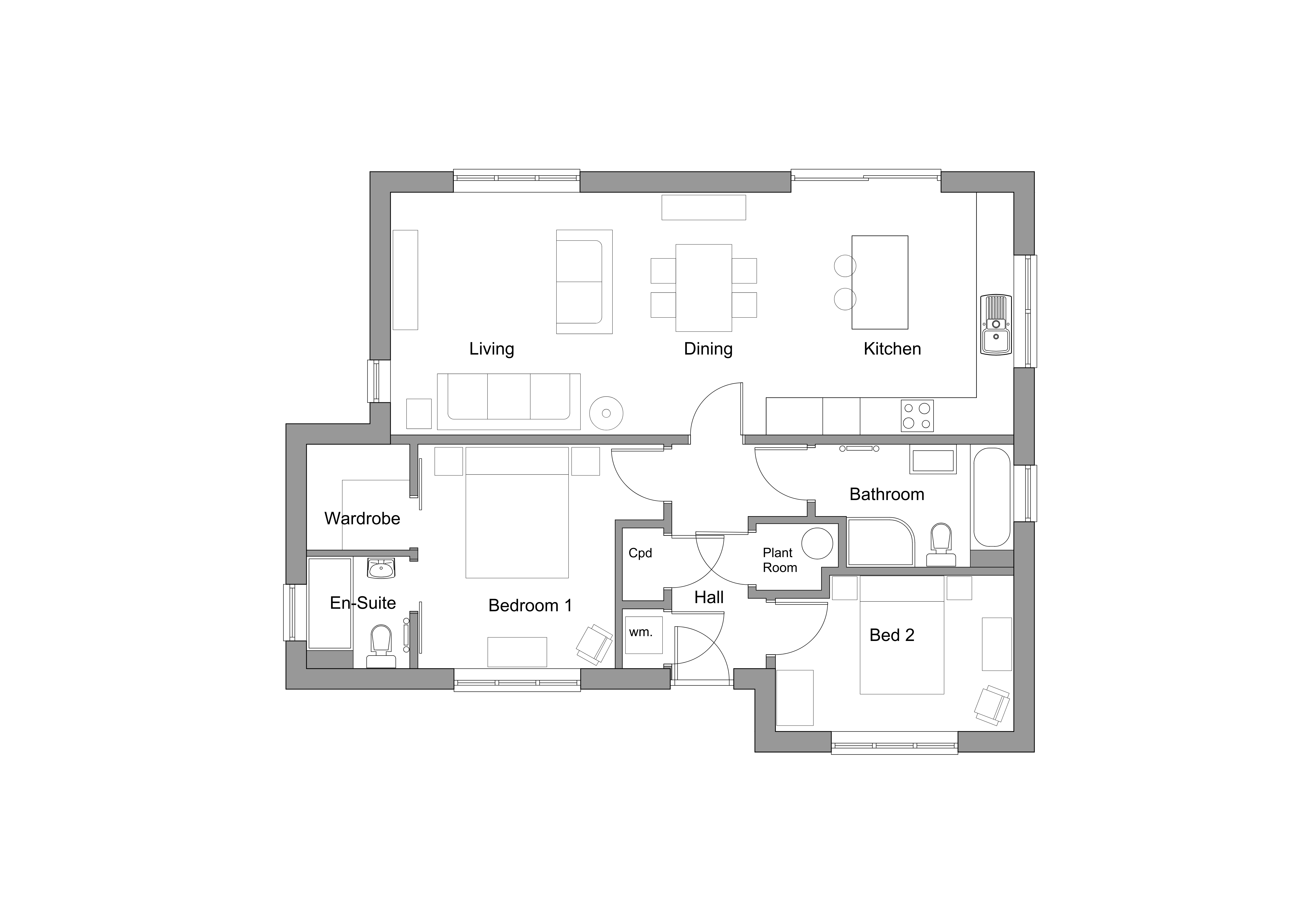 convert this floor plan into a realistic isometric 3d view of a full house show the space from an elevated angle with furniture walls and details visible maintain existing architecture keep window and door openings and room layouts exactly the same as the source image use the same furniture as shows on the plan do not change the orientation of the floorplan