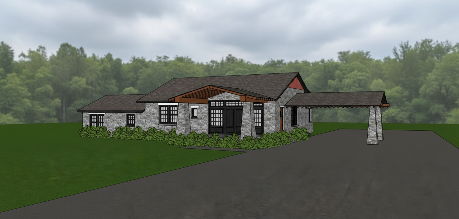 exterior shot render a modern mid century inspired house with a flat roof design the facade features a harmonious blend of natural wood and smooth white walls large sliding glass doors and windows framed in sleek black aluminum offer expansive views the door is black with frosted glass panels outside vibrant green foliage surrounds the house contrasting with the bright blue sky a neatly maintained deck with minimalist outdoor furniture in neutral tones completes the look the atmosphere is serene and contemporary bathed in warm natural sunlight