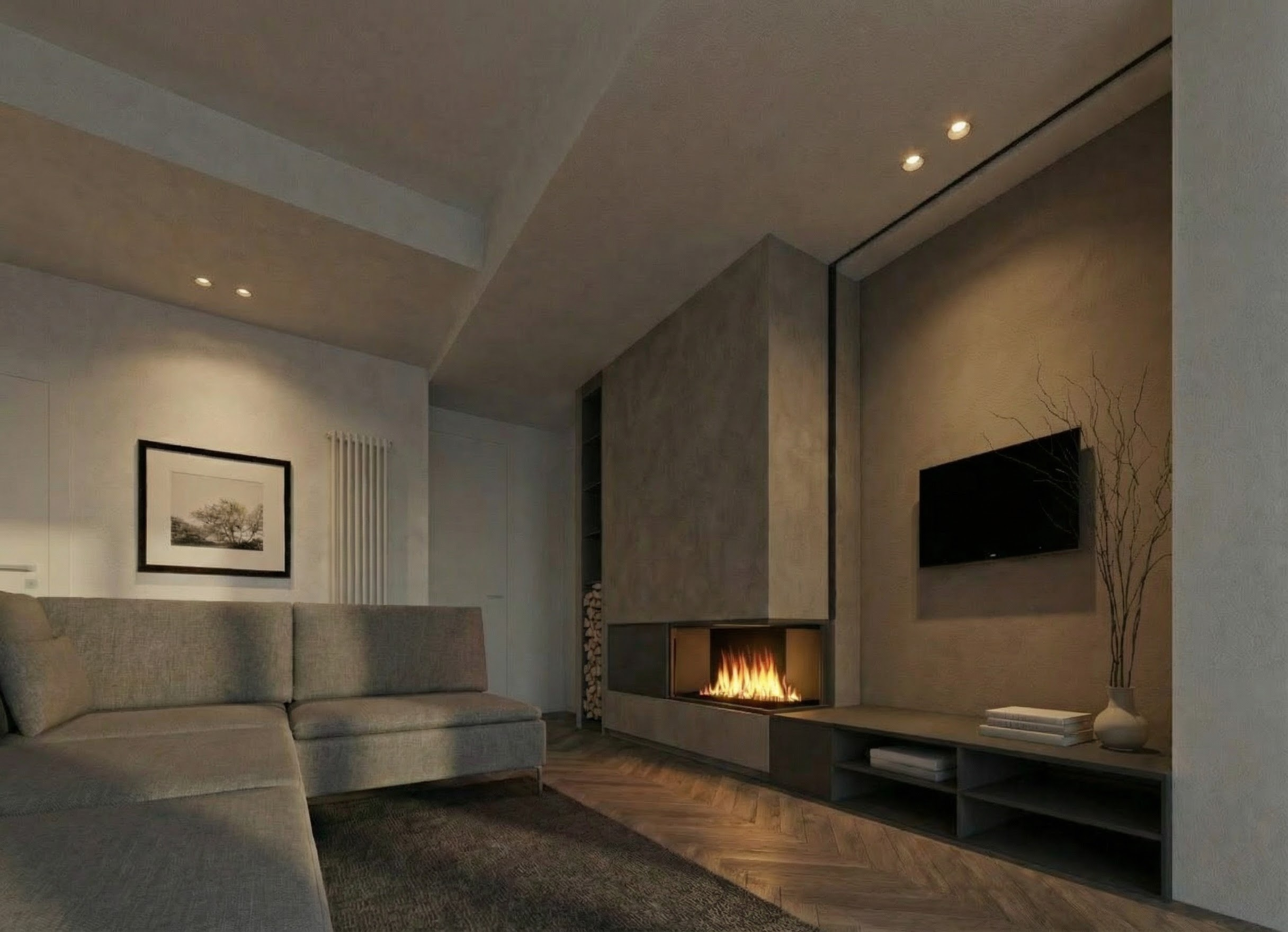 create a photorealistic render based on the uploaded 3d image while preserving the original layout proportions furniture placement and architectural composition exactly as shown the goal is to enhance realism without redesigning the space turn on realistic lighting inside the two hanging tubular chandeliers making both tubes emit a soft warm white glow around 3000k with subtle light falloff and elegant reflections add a soft warm backlight behind the mirror creating a hidden led halo effect that glows gently around the mirror edge without overpowering the scene add a minimalist floating cabinet intersecting the mirror area with a very clean modern design thin proportions and a light neutral or soft wood finish that partially overlaps the mirror in a refined way all walls must remain pure matte white with a clean plaster look no color tint no gray cast and a very bright white interior feel the door and trims should remain white as well enhance the floor using the same marble pattern but make it a polished glossy material with strong but realistic reflections keeping the same veining and tile layout while increasing reflectivity maintain a bright clean modern luxury interior aesthetic with soft global illumination realistic reflections and natural color balance do not modify the architecture mirror shape bench chandelier design or panel layout