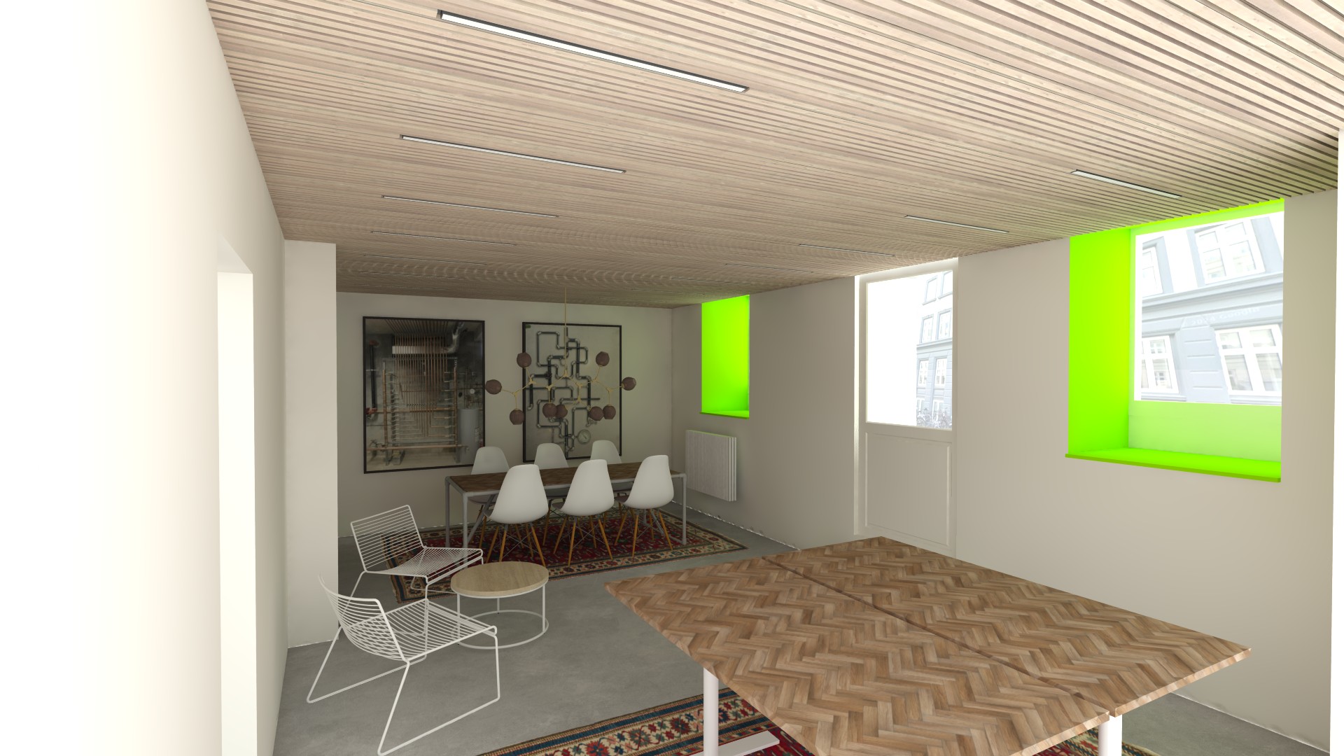 render this image with realistic materials keep room geometry exactly as in the input no modifications to openings windows or roof shape add light to the lamps in the ceiling and over the table do not add extra lamps or furniture transform the picture into a varm and nice office with cool designer stuff render this image with realistic materials keep geometry exactly as in the input make it look nordic cool no modifications to openings windows or roof shape material and lighting enhancement only preserve all shapes thicknesses and proportions put cool plumbing fittings in the window