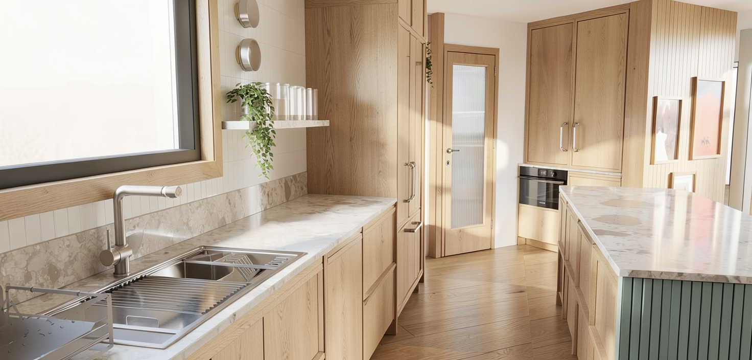 show this home as a photorealistic rendering keep exact architectural details add a rug on the floor clothes hanging under the upper shelf between the cabinets