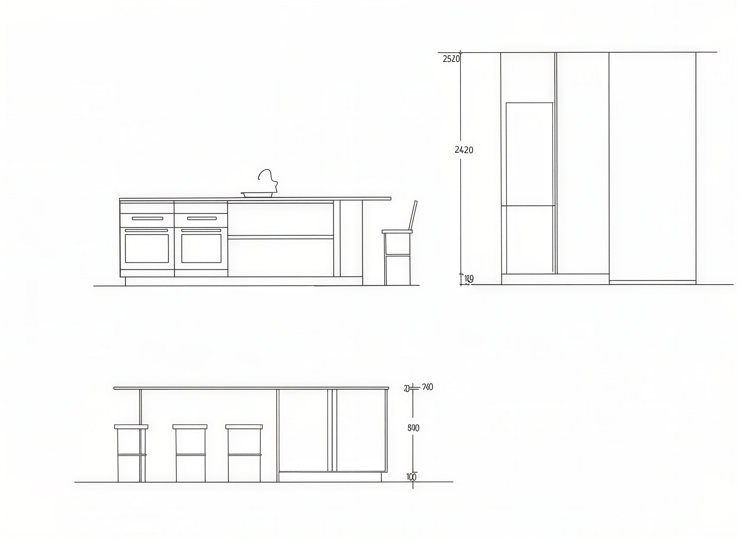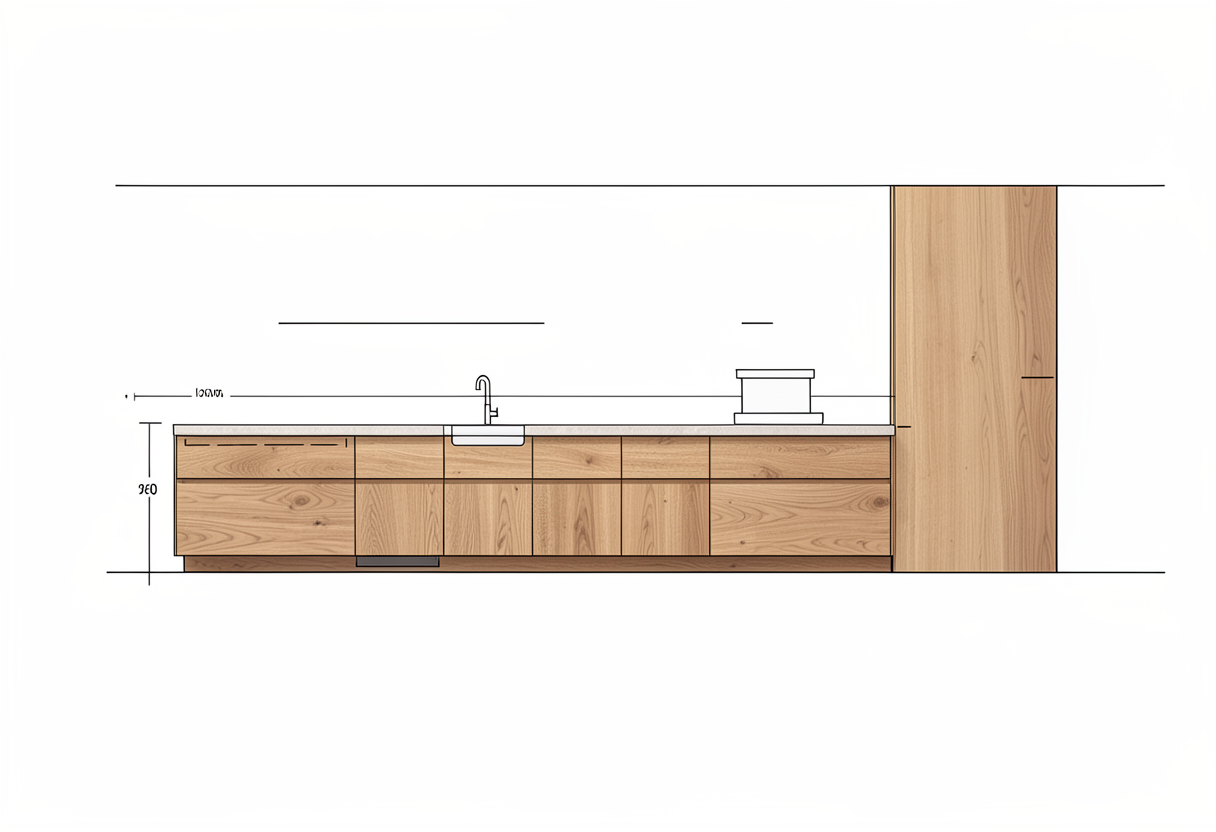 convert this hand drawn kitchen elevation sketch into a clean professional a3 presentation sheet that looks like it was precisely drafted in autocad preserve the exact kitchen design geometry proportions and layout from the original sketch do not redesign reinterpret or modify the kitchen the drawing must remain faithful to the original sketch transform the sketch into clean architectural cad style linework sharp precise black lines consistent architectural line weights crisp technical drafting style similar to autocad clear and professional architectural drawing quality remove all logos branding and watermarks arrange the elevations neatly on a minimal and elegant a3 presentation layout with balanced spacing and margins similar to professional architectural presentation sheets apply subtle color to the drawing while keeping the technical drawing style kitchen fronts finished in natural walnut wood with a warm tone and subtle wood grain countertop in a light composite stone color soft neutral tone keep the coloring refined and architectural not overly photorealistic maintain the clean cad drawing appearance use a white background and minimal presentation style suitable for a high end interior design presentation the final result should look like a professional architectural kitchen drawing sheet created in autocad with subtle material indication all the cabinets are all wallnut