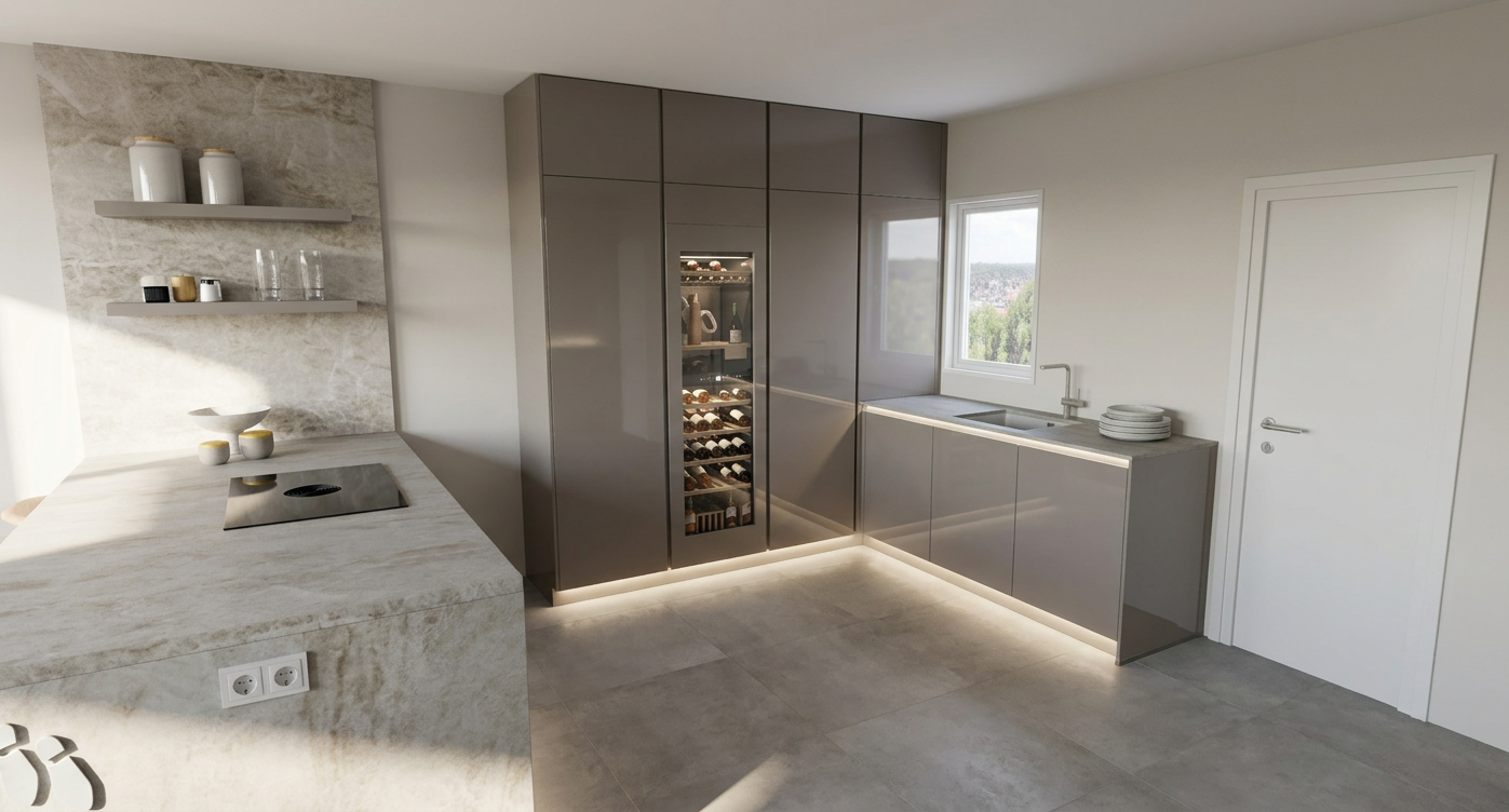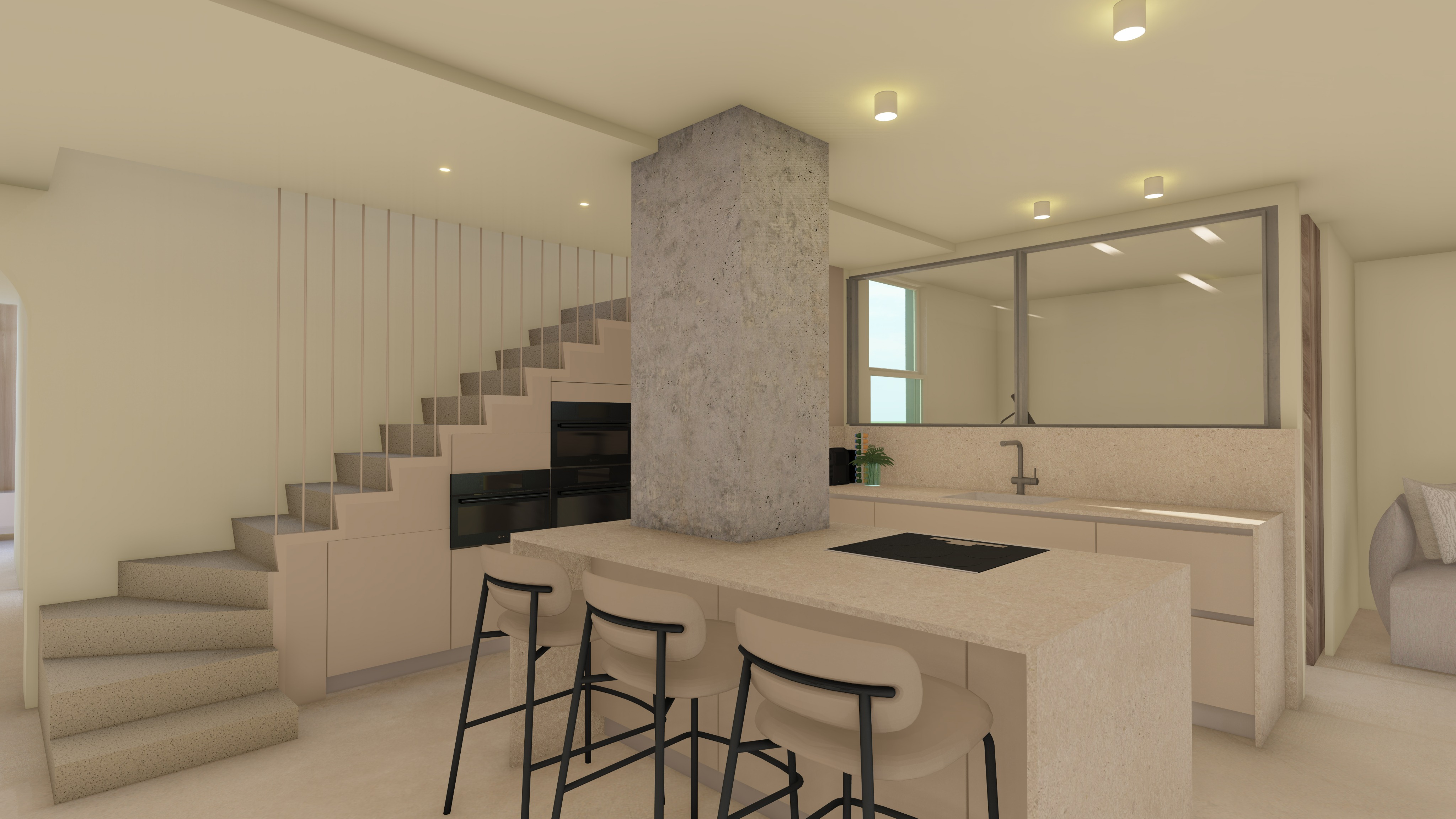 here is a high quality prompt designed for ai image to image rendering that will turn this into a photorealistic architectural visualization while keeping the exact layout photorealistic ai render prompt kitchen interior hard constraints preserve the design preserve the exact architecture layout geometry camera angle and furniture placement from the reference image do not redesign the space move objects or change the composition maintain exactly the kitchen island with integrated cooktop the central concrete column passing through the island the three bar stools in front of the island the stairs on the left side the built in oven units under the stairs the long kitchen counter with sink behind the island the large interior window above the counter the open seating area visible on the right the minimal ceiling with recessed lights only enhance realism lighting materials and textures scene description modern minimalist interior kitchen with warm neutral tones and sculptural architecture the space includes a large kitchen island made of light stone or travertine a raw concrete structural column integrated into the island three upholstered bar stools with dark metal frames a built in induction cooktop on the island minimal cabinetry in warm beige tones integrated ovens under the staircase large interior glass window above the sink area concrete staircase with minimalist vertical railing soft neutral flooring lighting is warm and architectural material realism improvements the stone surfaces island and countertop should show realistic stone grain micro surface roughness subtle imperfections soft natural reflections the concrete column should show natural pores realistic texture variation subtle edge imperfections slight roughness the stairs should have realistic stone or concrete texture the bar stools should have matte metal frames soft fabric or leather upholstery realistic shadows under the chairs the glass window above the counter should show subtle reflections of the interior cabinetry should be matte lacquer or wood veneer with soft reflections lighting improvements use realistic architectural lighting soft daylight entering through the windows subtle bounce lighting from surfaces global illumination soft shadows warm recessed ceiling lights ray traced reflections the image should feel like professional interior photography rendering keywords photorealistic interior architectural visualization ultra realistic materials global illumination ray tracing cinematic lighting physically based rendering high detail textures interior design photography 8k negative prompt no layout change no architecture redesign no extra furniture no missing objects no geometry distortion no exaggerated reflections