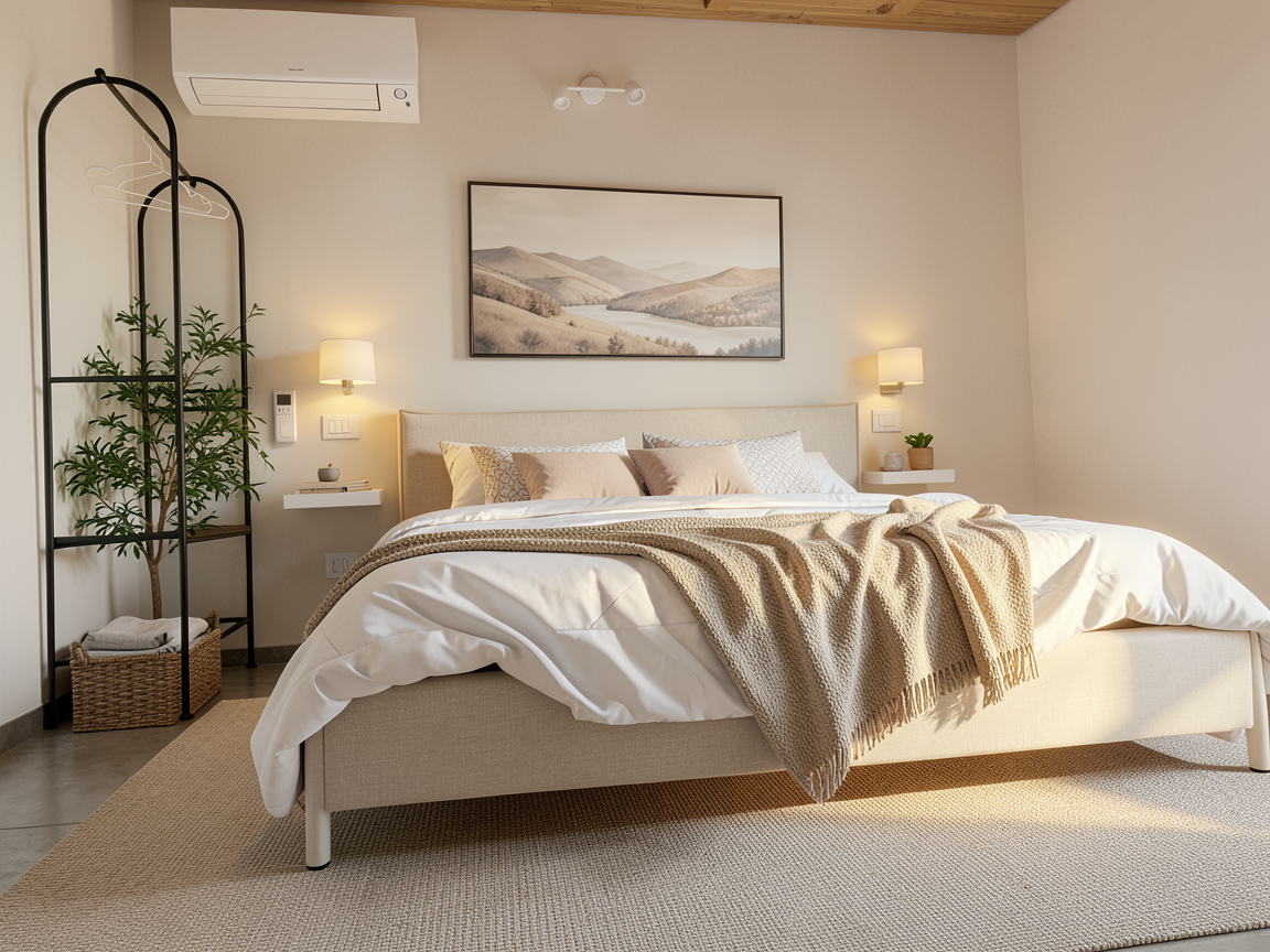this is a real styled bedroom image keep everything exactly as it is layout bed rug artwork colors and lighting make the following precise corrections only 1 remove the large plant tree next to the black rack completely 2 keep the black rack clean and minimal only a basket at the bottom optionally a folded towel no plants inside or around it 3 fix the lighting remove any wall mounted lamps add two small bedside table lamps placed directly on the floating shelves one on each side of the bed lamps should be minimal warm light soft fabric or neutral shade 4 keep the scene balanced and uncluttered maintain minimal scandinavian styling no additional large decor elements enhance slightly keep warm natural lighting maintain soft cozy atmosphere do not change bed rug or artwork add new furniture move objects alter proportions or perspective the final result should look clean minimal and realistic like a professionally styled airbnb bedroom