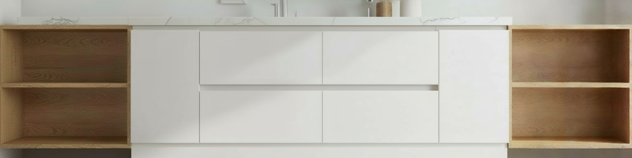 make the benchtop 20mm and run it the whole length of the cabinets