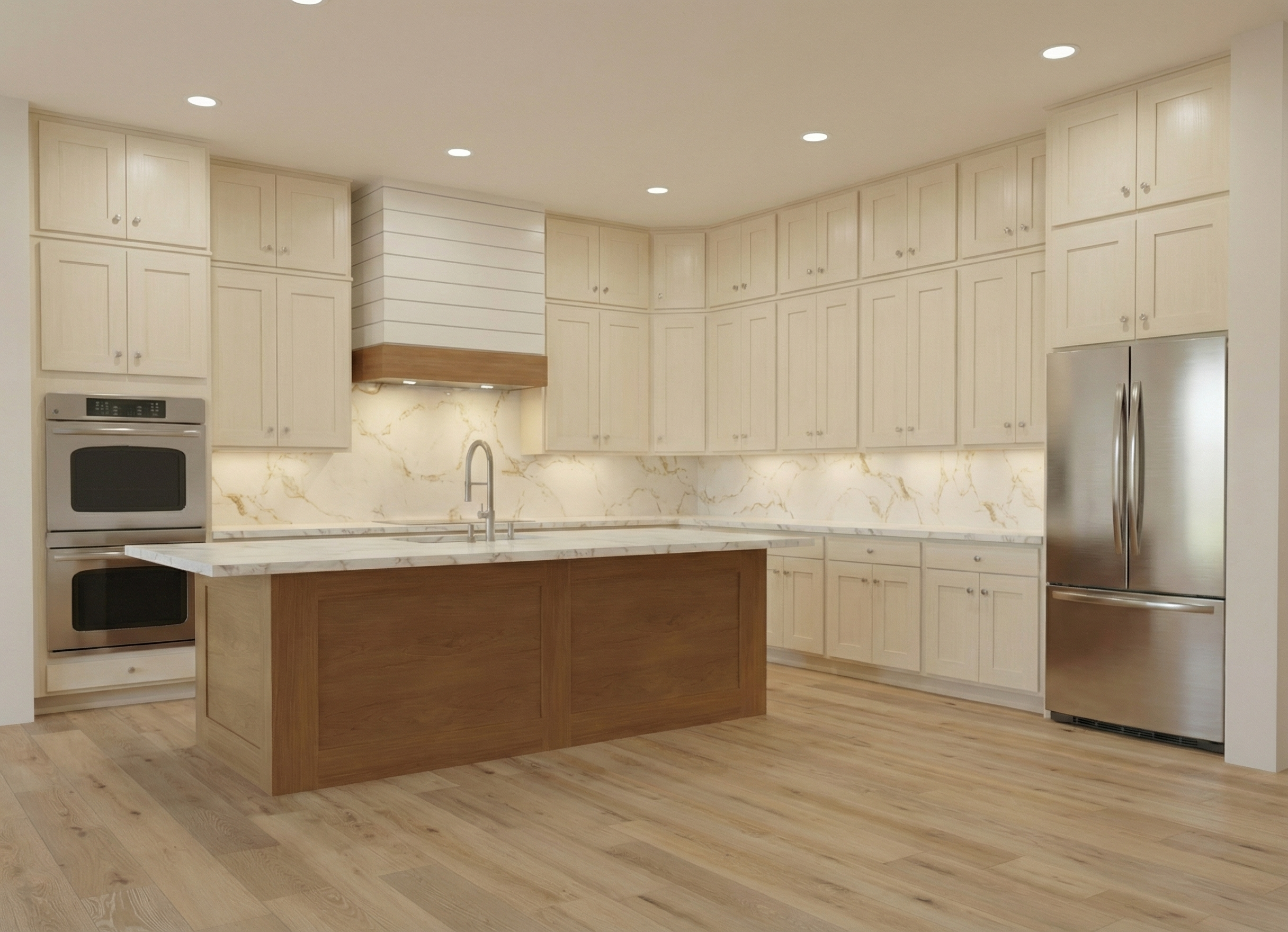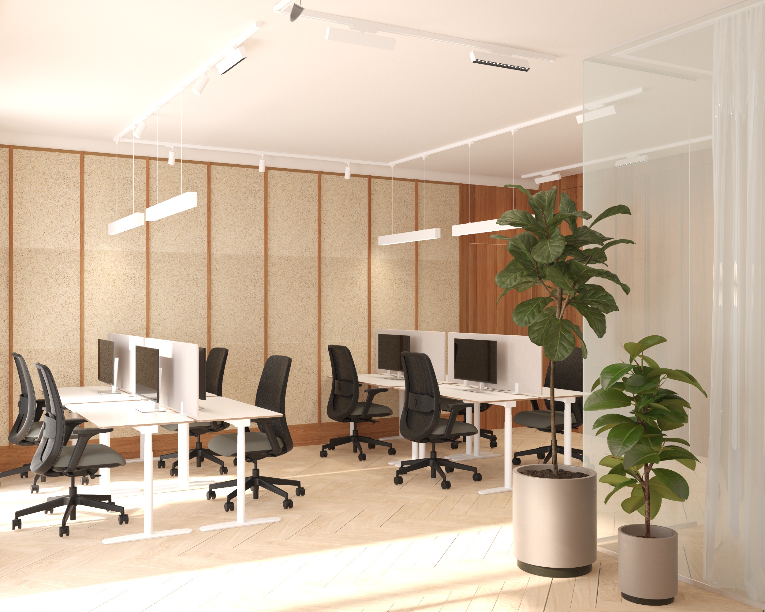 transform this 3d view into a high end photorealistic architectural render add a little natural sunlight entering from the left side of the camera creating soft shadows and realistic light bounce but keep the whole image light and not too warm office vibe with a little domestic atmosphere on the right side there is a glass cubical the wall in the front behind the desks is covered with wood wool acoustic panels light natural wood tone fibrous texture enhance material detail realistic reflections global illumination and natural color balance keep the original geometry and camera angle unchanged