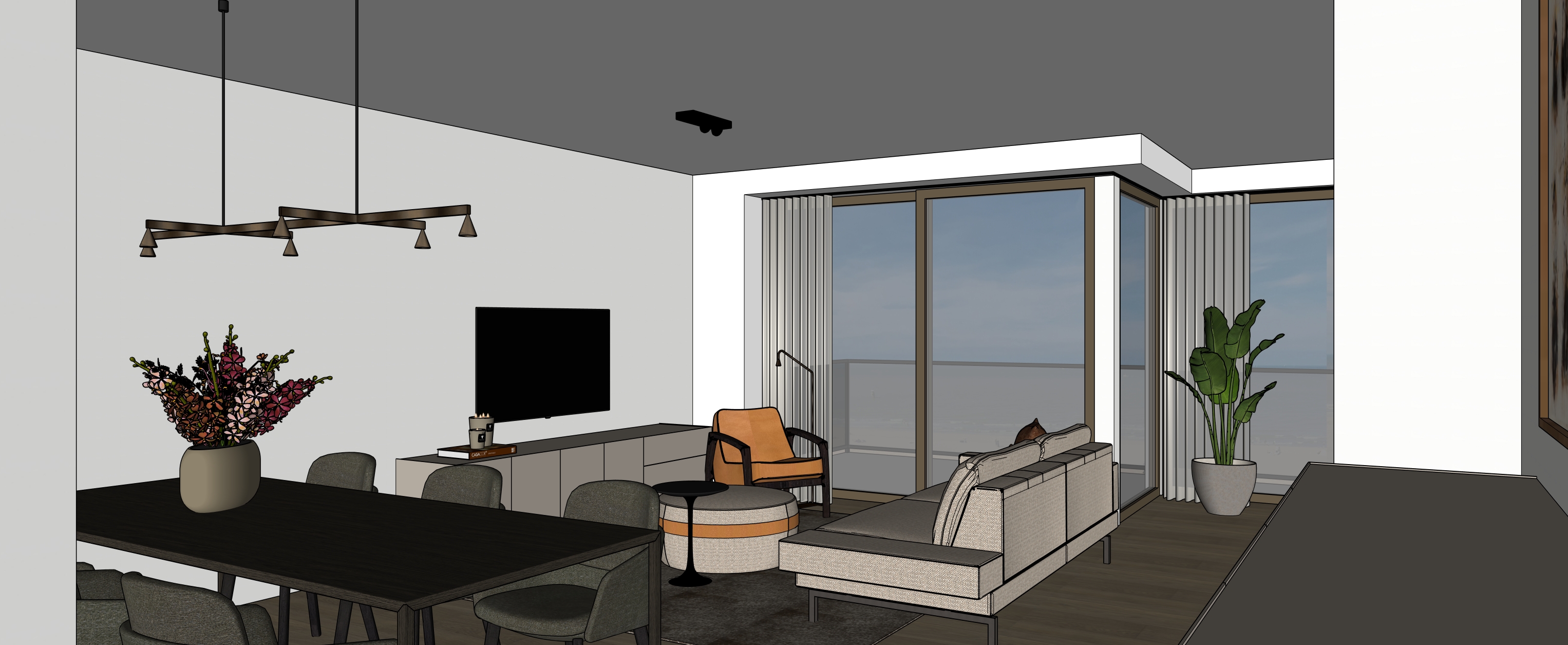 realistic interior shot more natural warm daylight realistic sea and beach view floor is light oak pouf same fabric as sofa