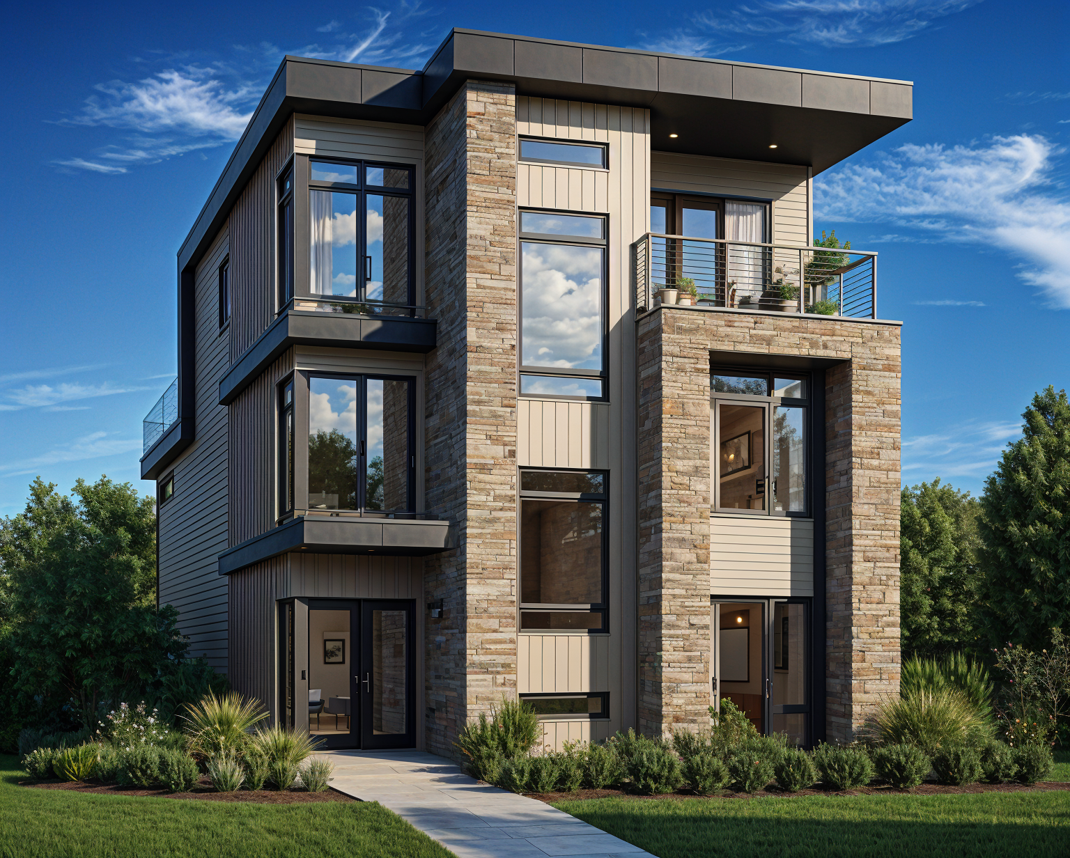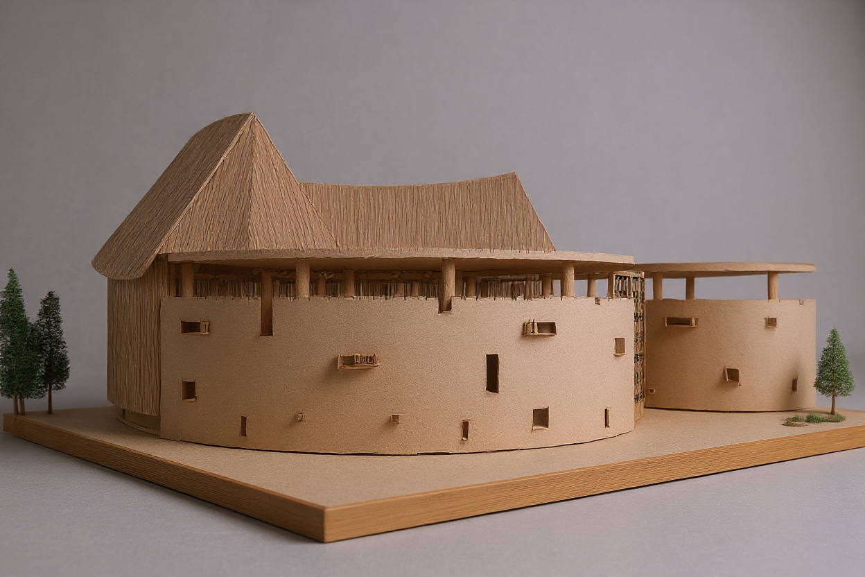 the architectural model is mounted on a base made of the same material and is accompanied by small miniature trees placed on both sides providing scale and context the background is neutral and gray typical of a studio photograph for architectural models the model itself is crafted from materials resembling balsa wood or kraft cardboard with ot the top of the roof