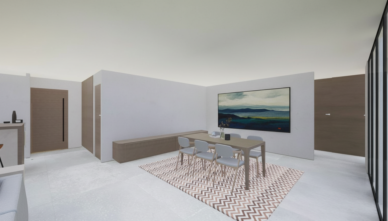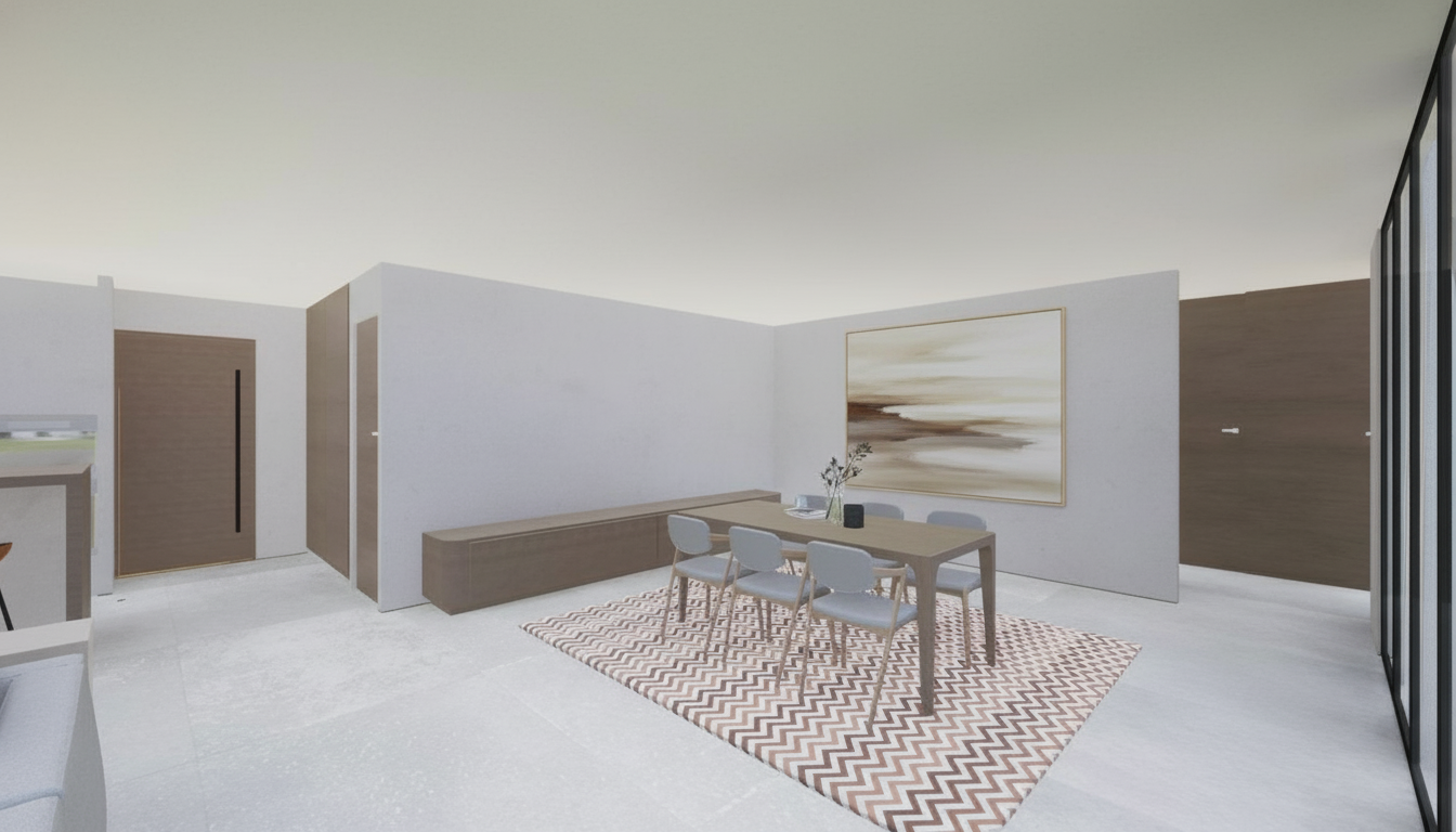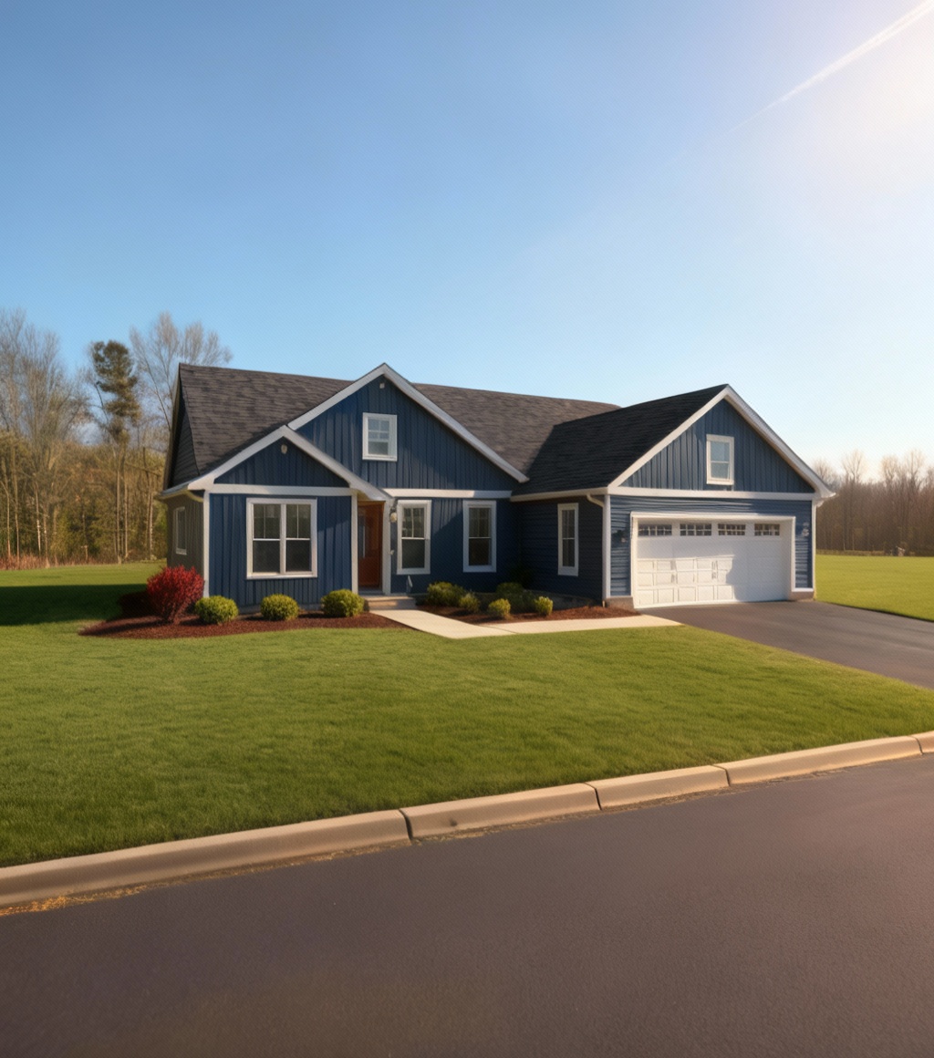 boost the realism of this modern home in rural vermont with a clean and professional look maintain the gray and black forms of the building pictured without distorting their shapes or perspective enhance the clarity and texture of the wood clapboard facade and the large glass windows add realistic lighting effects including soft natural sunlight that highlights the architecture include well maintained landscaping with lush native new englan grass additional trees and subtle shadowing from the building and surrounding trees adjust the sky to a bright clear day at golden hour to give a vibrant yet polished atmosphere refine the reflections on the windows to enhance the depth and dimension of the glass making the overall scene look more immersive and lifelike show the trees as changing in color