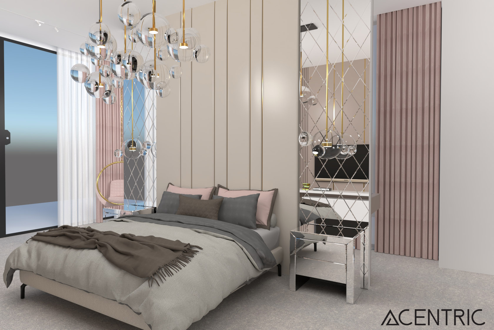 make the glass globes of the chandelier transparent without the refraction add more enviormental light in the room and especially in the curtain area behind the bed
