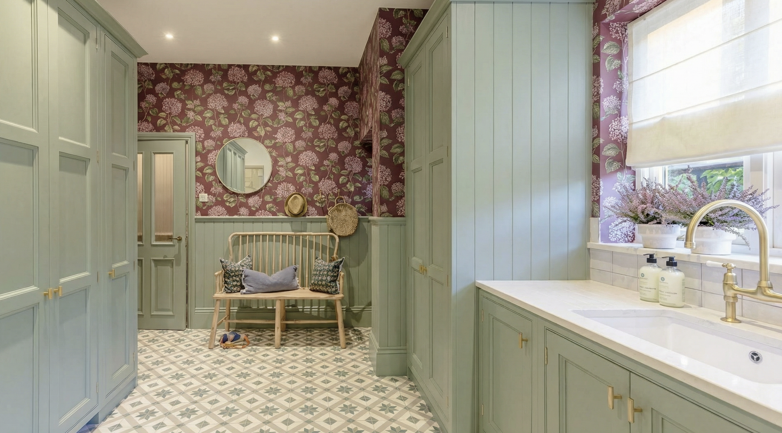keep all elements of this image and change the floor to bella cera ravello hardwood in the del toro finish leave the cabinets and wall trim in the green no other changes maintain a crisp photo realistic detail in the image