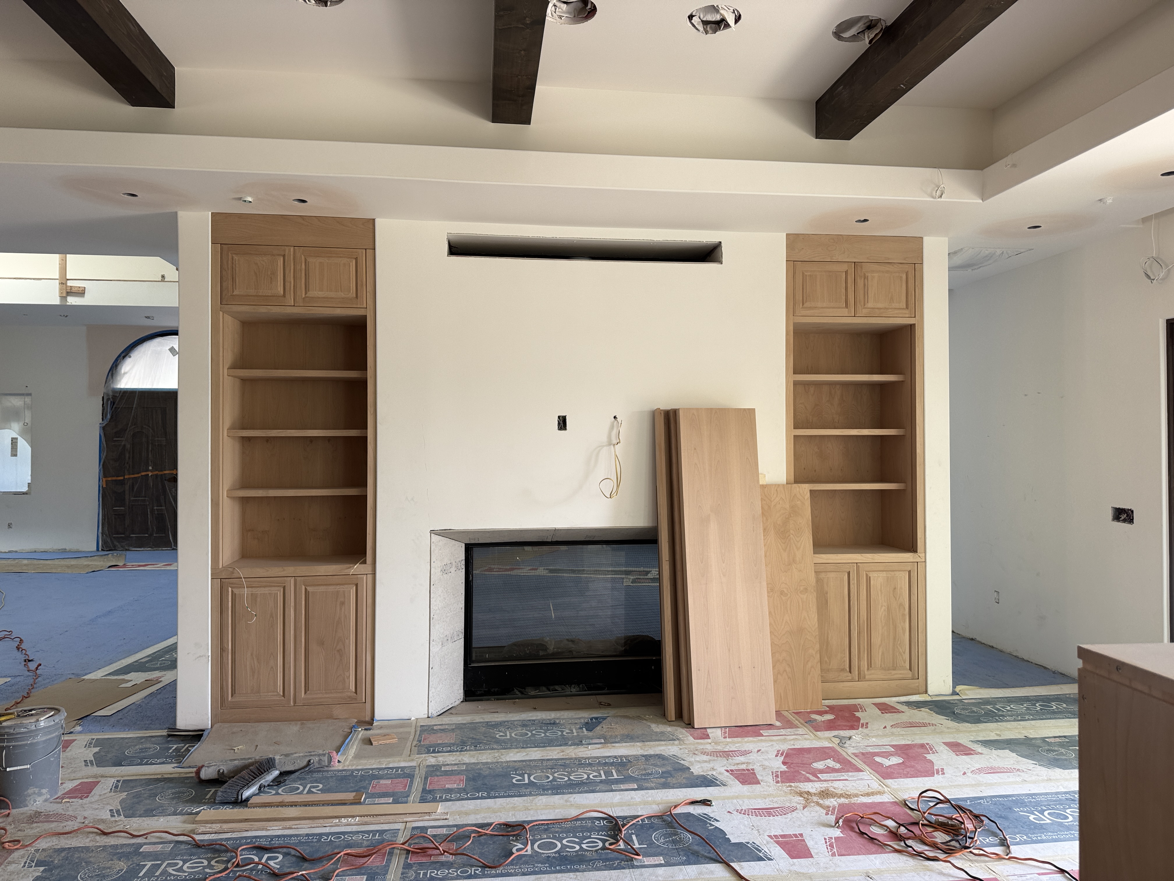 this is a new build the cabinets should be white oak color stained wood cabinets the floor should be a medium color white oak wood plank floor there should be lots of natural daylight add off white upholstery lounge upholstery throughout the space add white oak built in cabinets that flank the fireplace to the left add book matched white marble along the fireplace