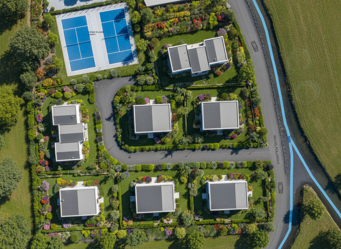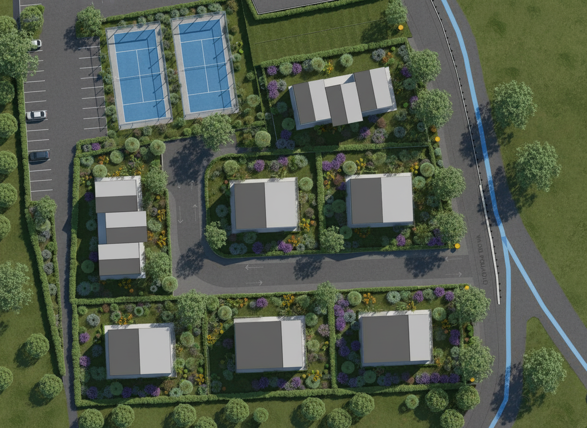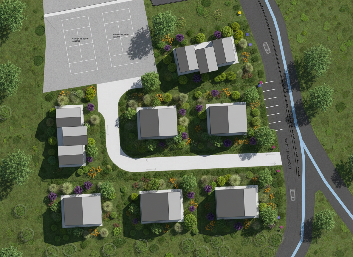 manicured lawns with minimal landscaped flower beds at each home small tree at front hard to remain