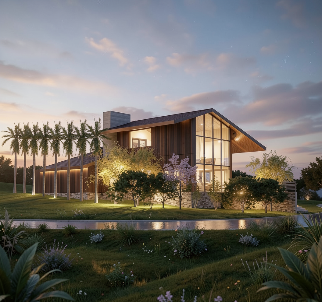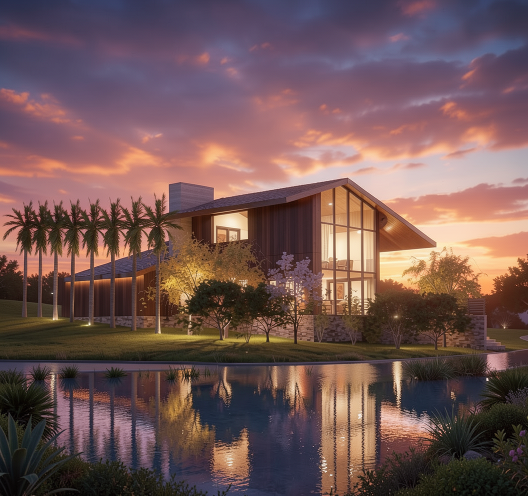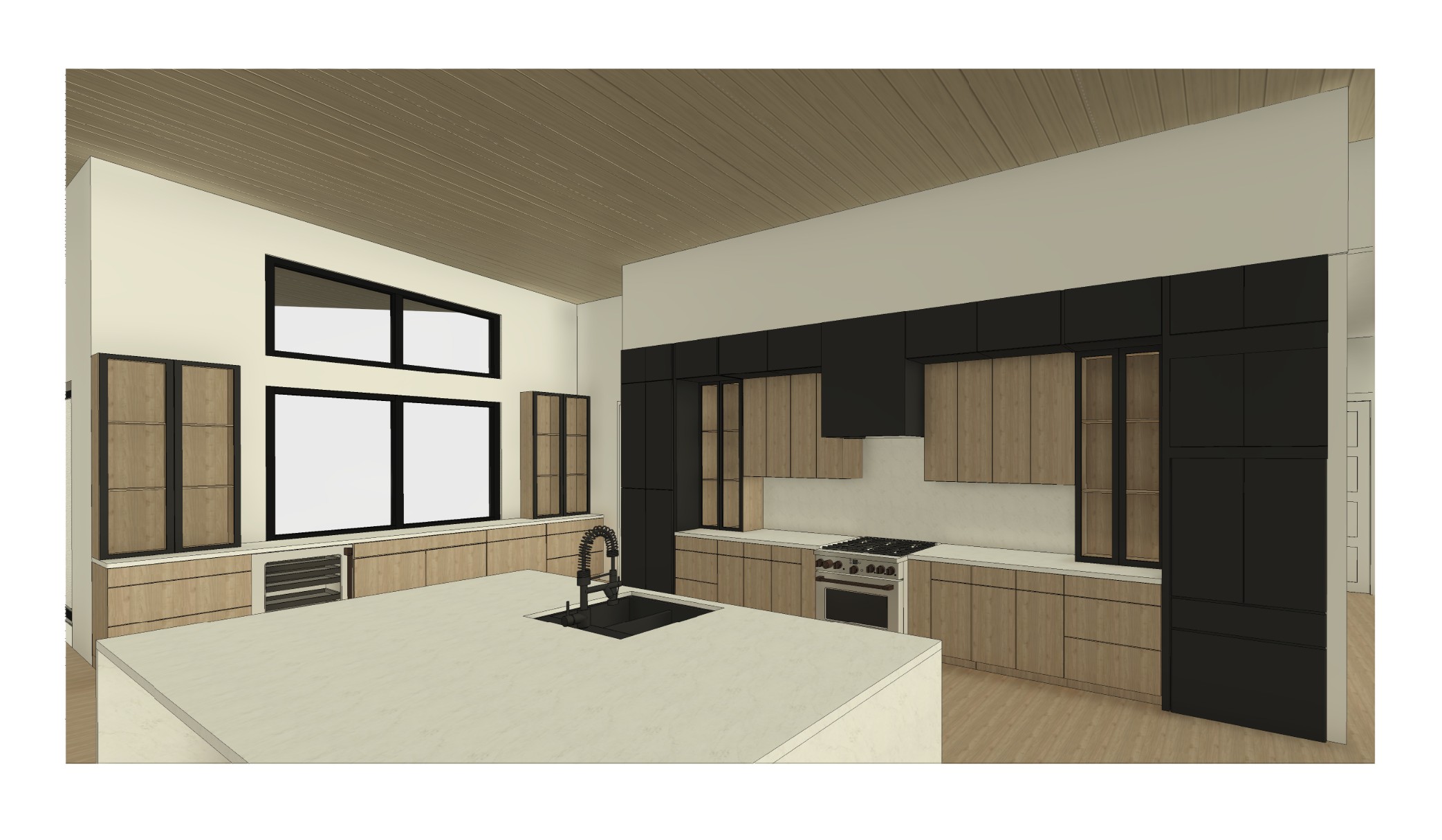 create a render in hyper realistic architectural visualization quality 8k architectural features must remain in place the wood cabinets are a ashy light oak color no warmth the black cabinets are matte the countertop and backsplash is white with gray cloudy veins the glass cabinets have a black band trim dont delete anything from the image the spatial configuration must remain unchanged add gentle reflections soft shadows slightly enhanced color richness and luxurious level realism improve depth and realism through wood grain richness keepi the entire scene exactly as originally designed use general daylighting please add some decor throughout the kitchen especially in the glass shelves do not add any lighting in the ceiling add some trees visible outside the window