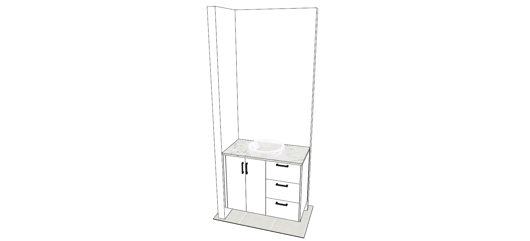 flat white cupboard panels beams of sunlight coming in arch small mirror on wall water in sink