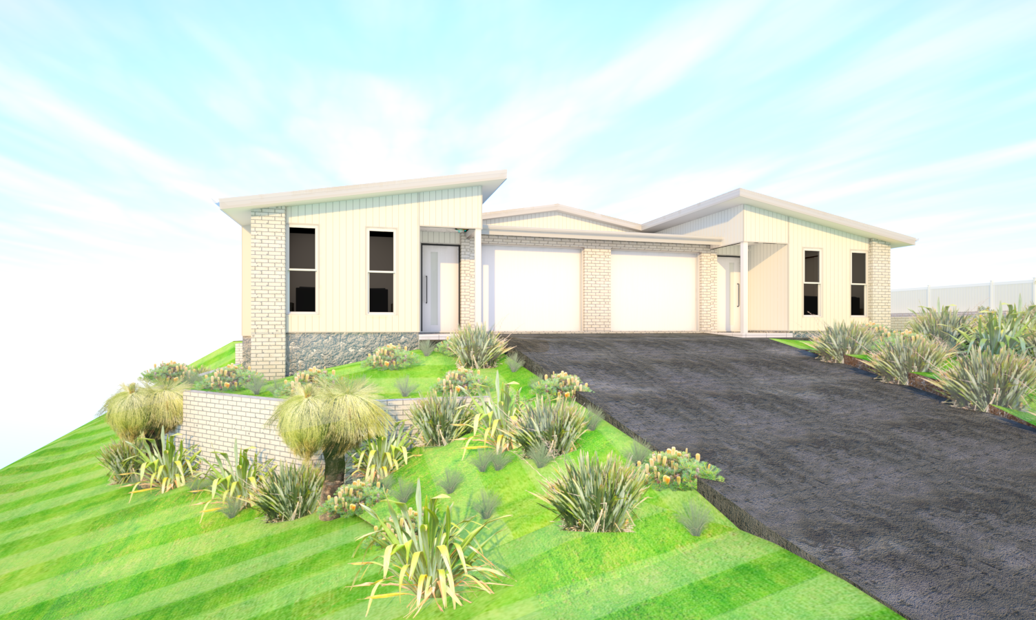render a photorealistic 3d perspective of this house in cairns queensland australia reference the current material style just enhance them keep model geometry the same windows doors roof walls sidings posts garage door pavement driveway make a lush vegetation that looks native to cairns do not change the view only enhance the current materials and make the landscape nicer vegetation detailed textures in the fibre cement siding and glass less reflection and a vibrant clear sky with light atmospheric depth render in hyper realistic architectural visualization quality 8k resolution