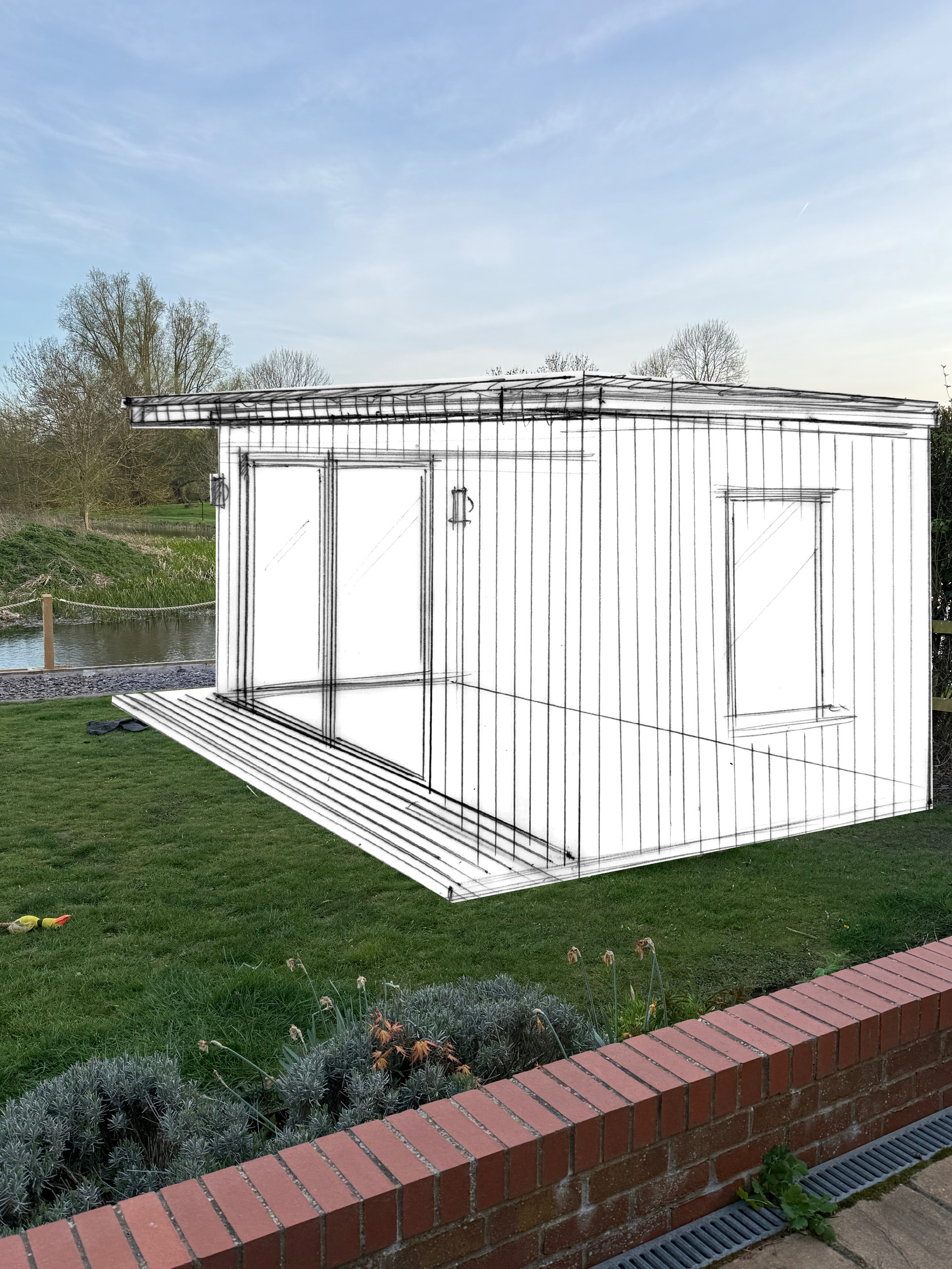 turn the sketch into a oak oak vertical clad garden room with black framed patio doors and window and oak decking