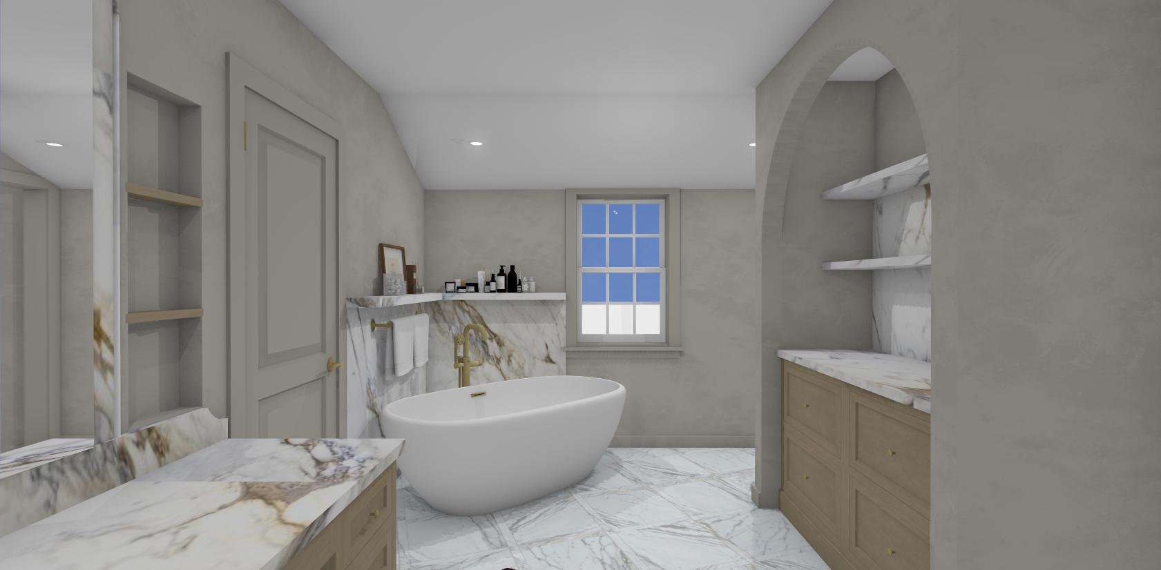 do not change any materials or any architecture shown in the image cabinetry should be rift cut white oak wood with a light stain color all marble should be shown in a honed finish please add decor and cosmetic items to the shelves please also add a soft glow of lighting coming from behind and around the edges of the vanity mirror on the left also add lighting to the underside of all shelves shown