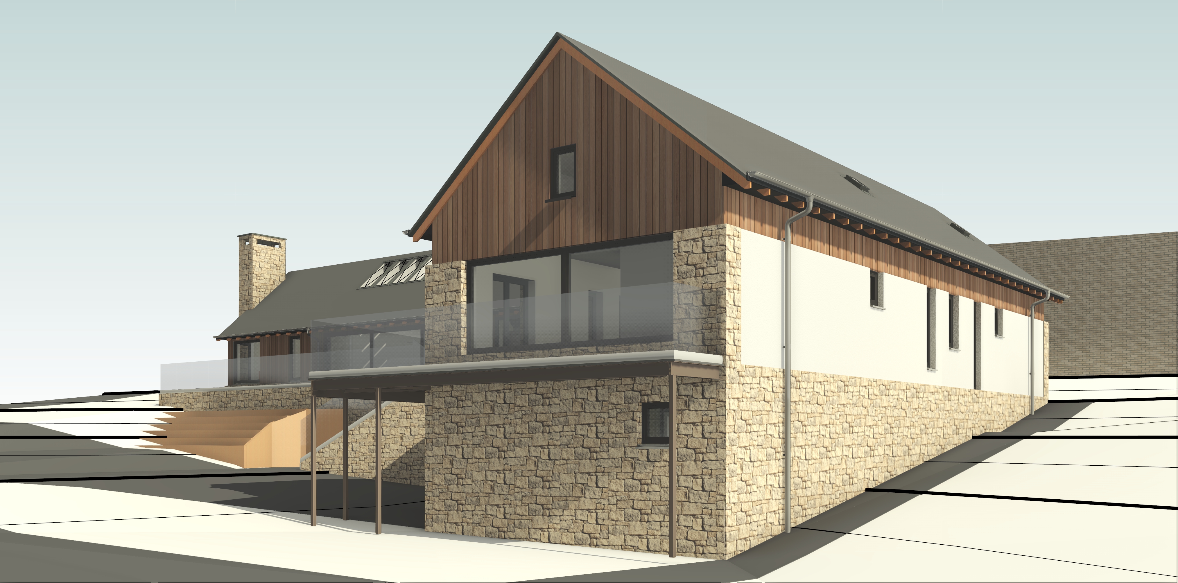 add weather as sunny with few clouds trees and grass to white ground make grey driveway paving make cream brick a buff cream stone timber sleepers to go sloping up hill as shown