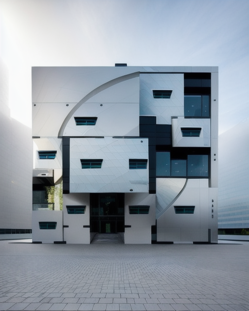 zaha hadid exterior shot a modern house with a symmetrical design featuring white stone walls and contrasting dark trim the roof has a sleek black finish the double garage doors are a rich warm brown the driveway is a polished gray concrete reflecting the clear blue sky surrounding the house lush green grass adds a touch of nature the atmosphere is calm and bright with a serene suburban setting architecture