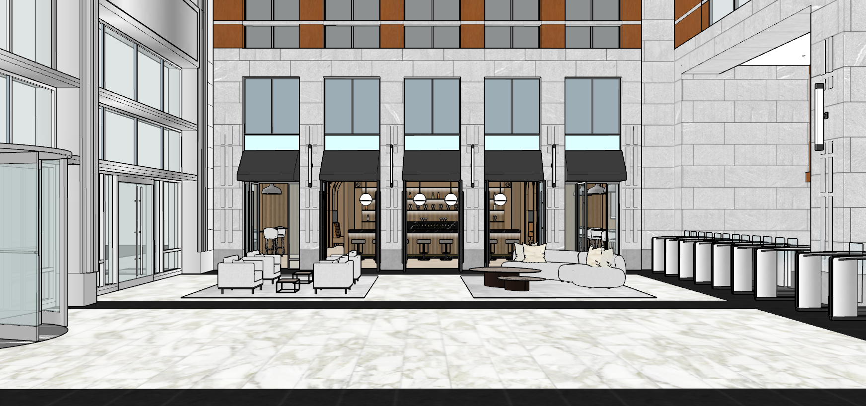 render a atrium lobby with access to the modern cafe with all sconces to be turned on all windows are opaque add business people walking in lobby and enjoying coffee on the sofas and stools setting in the middle of the day make floor glossy make interior bright and lit the view through the storefront glass is a city setting
