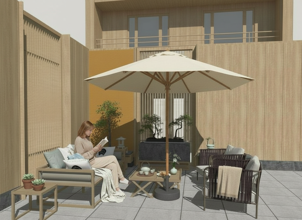 lepo dvorstie ispred lepe kuce devojka sedi na krevetu i cita knjigu
