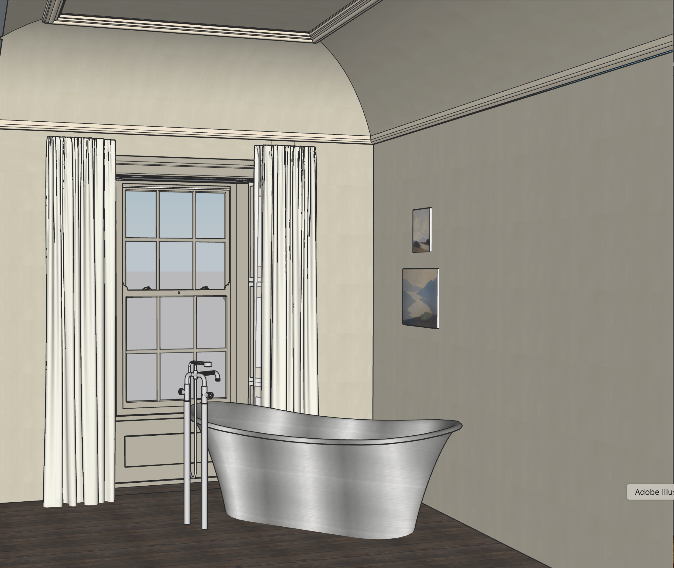 render this photorealistic lots of atmosphere look like it was taken on an slr camera limewash paint texture on the wall gloss sheen on wall tile diffused light atmospheric warm natural light coming from window heavy linen curtains simple bronze curtain rail editorial interior photography style elegant natural flattering soft shadows