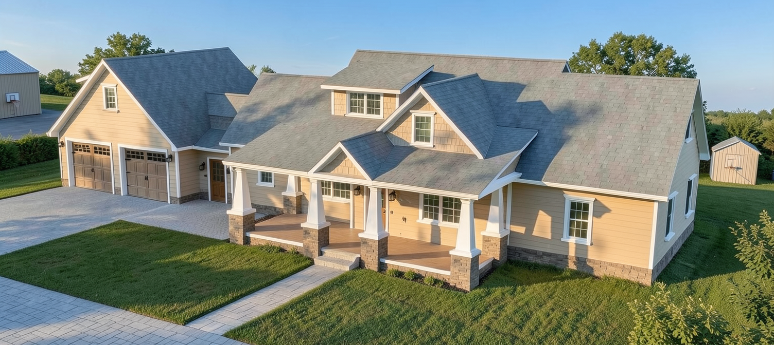 ender a serene country dwelling set against a clear blue sky the house should have a warm beige exterior with white trims and the roof in a soft gray shade the surrounding landscape is lush and green depicting well maintained grass highlight the driveway in a light gray stone color emphasize the front porch with elegant pillars in white reflecting subtle late afternoon sunlight for a peaceful ambiance add a distant basketball hoop blending naturally with the setting and ensure the atmosphere is calm and inviting ensure the sheds in the background appear well maintained