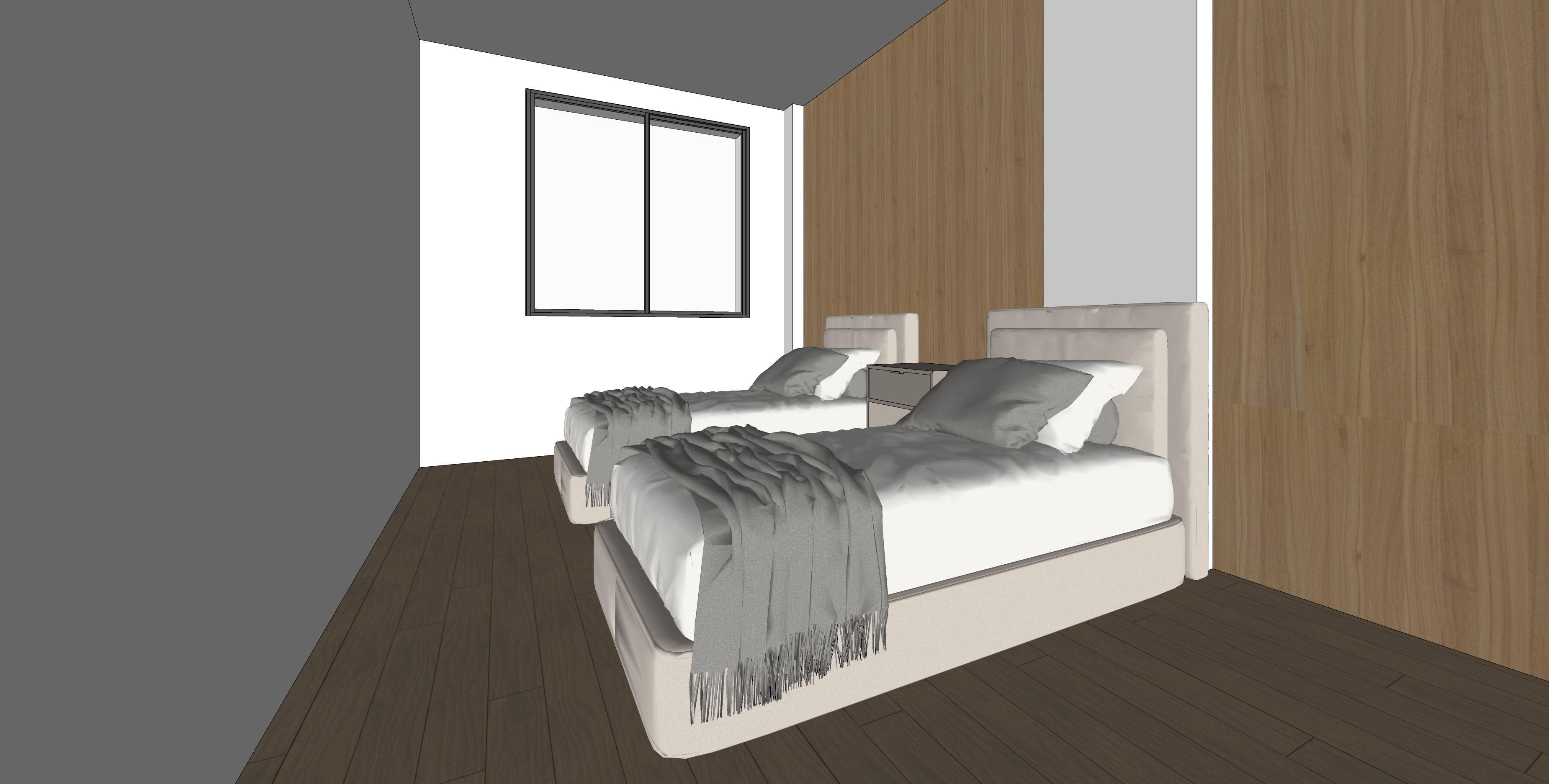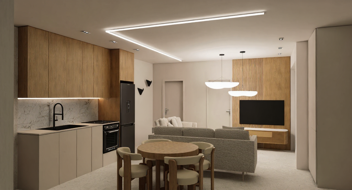 warm contemporary mediterranean luxury natural soft daylight entering through large windows 2700 3000k led cove lighting hidden behind walnut panels and ceilings matte wide plank wood flooring warm walnut vertical paneling creamy beige microcement in bathrooms soft textile textures high end minimalist furniture with curved edges neutral taupe and sand tones thick upholstered headboards with led backlight subtle decor stone surfaces with soft reflection black accents for faucets and hardware calm cozy expensive aesthetic cinematic photorealism with balanced shadows clean composition refined hotel suite ambience