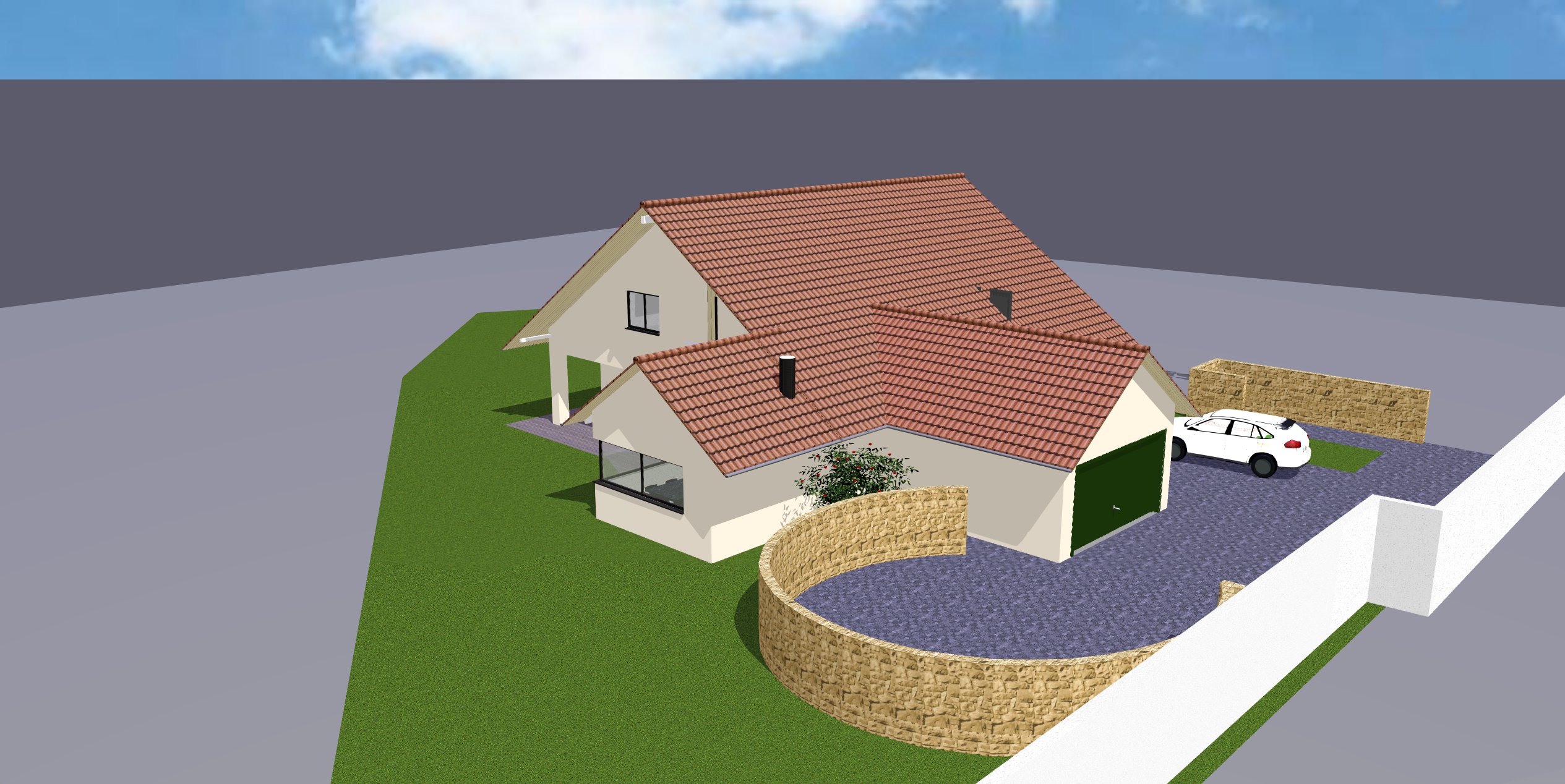 genau dieses rendering berarbeiten fotorealistisches foto exakt dieselbe perspektive und kameraposition wie das hochgeladene referenzbild 100 identische geometrie exakt gleiche anordnung exakt identische fensterpositionen mit gleichem ausblick durch die fenster weiches nat rliches tageslicht leicht schr g einfallende sonne durch die fenster alle r ume hinter den fenstern k nstlich ausleuchten sanfte realistische schatten realistische materialien echte texturen hochwertige oberfl chenreflexionen echte menschen echte autos pflanzen mit echten b umen und str uchern ersetzen gr ne fl chen mit wiese rasen und einigen b schen ersetzen sehr realistische umgebung belebte szene mit menschen und autos gr sse der erwachsenen menschen etwa 1 80 meter und proportional zum haus nat rlicher himmel mit leichter bew lkung nat rliche farbwiedergabe leicht warme farbstimmung golden hour feeling blickrichtung ist nach norden sonnenlicht kommt von westen f ge subtile atmosph rische effekte hinzu wie leichten staub in der luft oder nat rliche farbvariationen ohne die urspr ngliche szene zu ver ndern das bild muss wie eine professionelle fotografie aussehen es soll ein echtes und reales foto sein canon eos r5 35 mm festbrennweite f 2 8 hyperrealistisch dslr qualit t raw aufnahme 8k aufl sung extrem scharf perfekte tiefensch rfe professionelle architekturfotografie