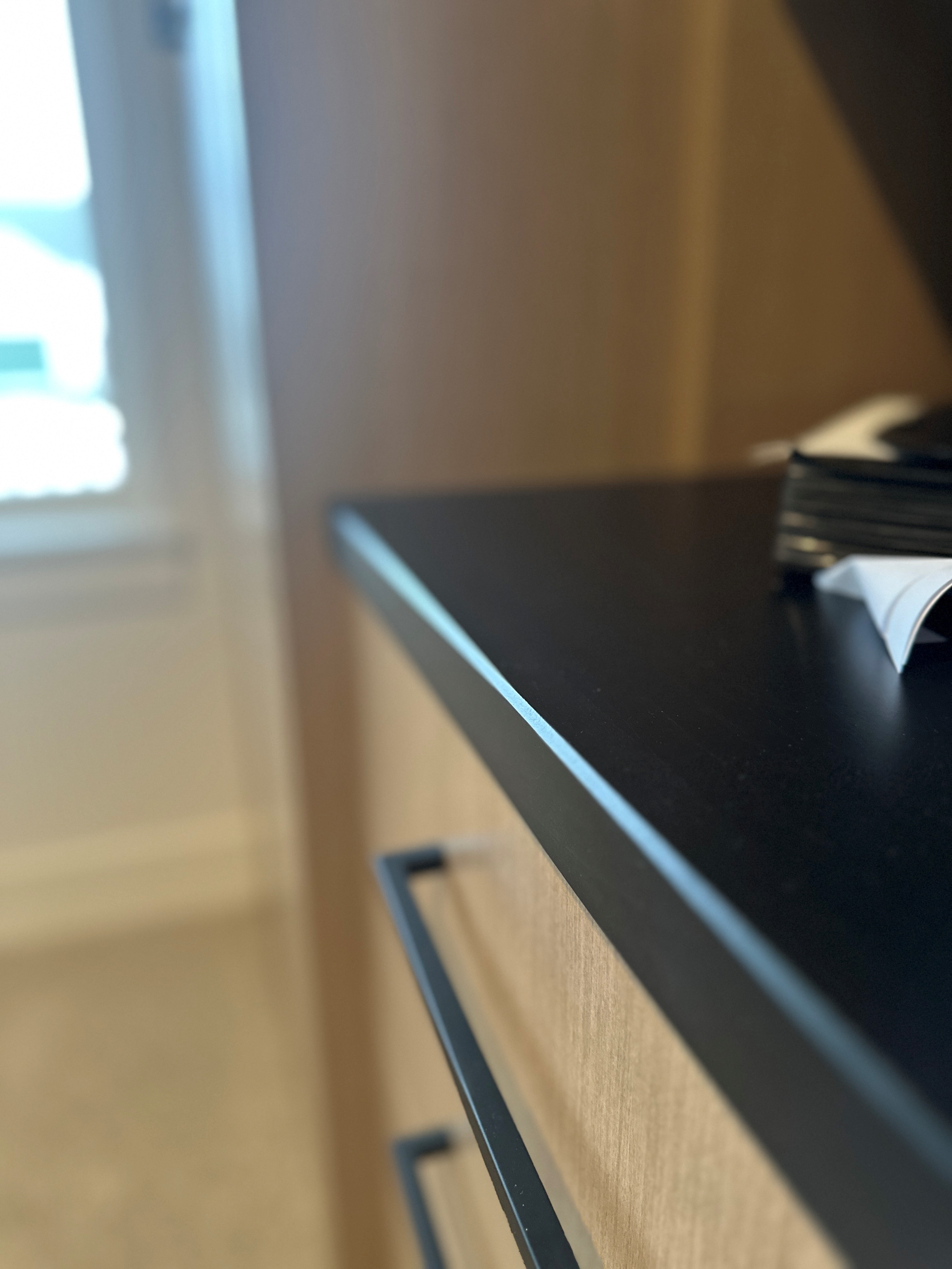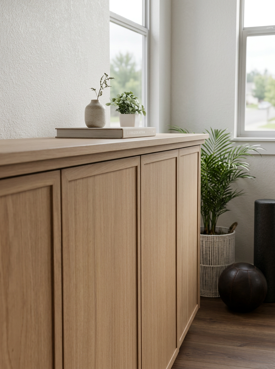 do not change the cabinets in any way preserve the exact cabinet colors materials finishes dimensions door and drawer styles hardware spacing alignment and all geometry exactly as shown do not alter the countertop shape backsplash appliances flooring lighting fixtures or wall structure only remove the construction materials clutter and mess from the scene clean the room and make it look finished and staged add a few simple tasteful home accessories appropriate for the style of the space but do not add or remove any furniture windows or architectural elements maintain the original lighting direction and realism enhance clarity and polish the photo while keeping the cabinetry and room design completely unchanged do not alter the lighting to keep the cabinet colors as they are in the image simple view out the window stage the top for an office