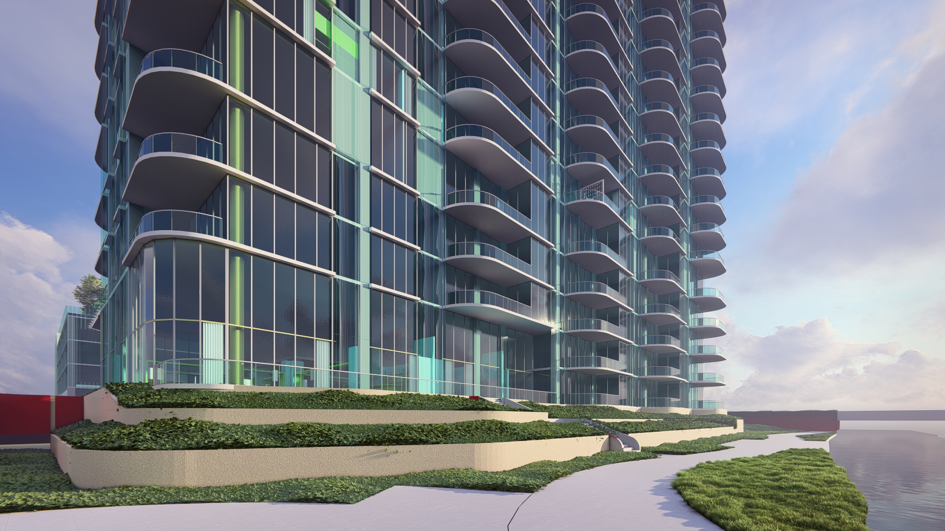 marketing rendering for luxury condominium tower add lush planting native to the woodlands tx non tropical plants high end textures dramatic daytime lighting environment