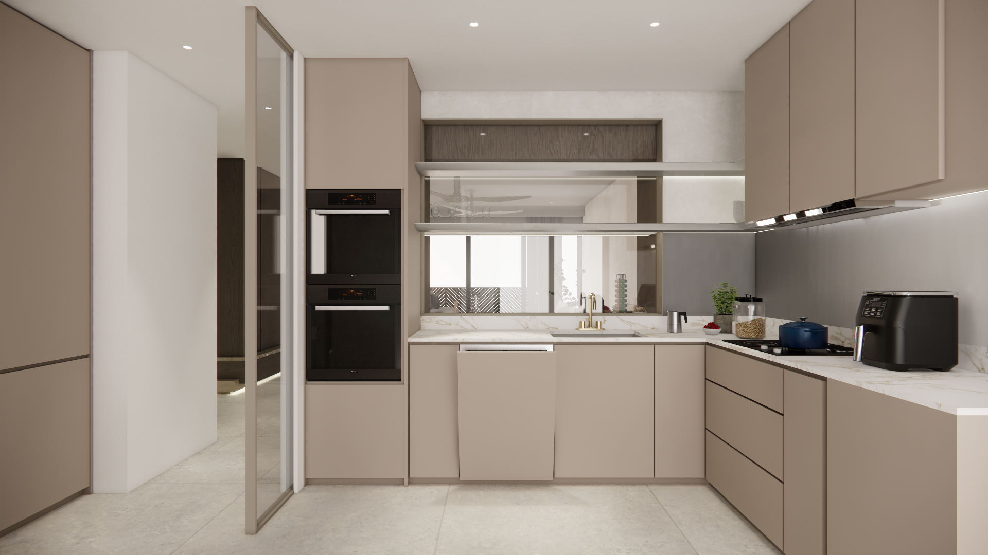 ame camera angle same composition same interior design do not change any geometry d cor placement or color tone enhance realism refined lighting balance realistic ies like light distribution if present natural shadow gradients improved material definitions fabric weave timber grain stone pores accurate specular highlights glass reflections cleaner edges less render noise final image must look professionally post rendered while remaining identical to the original proposal
