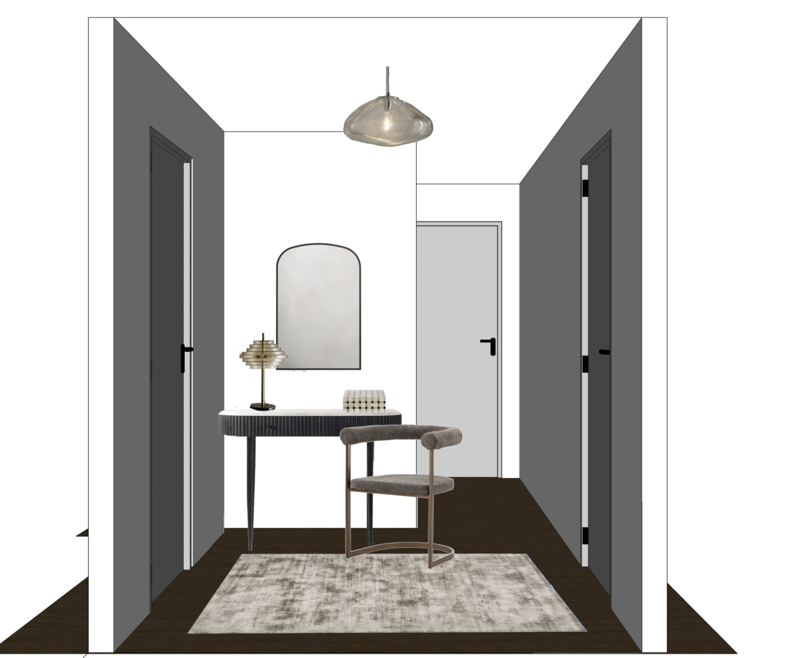 render my image add light source from the ceiling light walls should be dark grey woodwork and doors should be white keep the rug the same add light source to the light on the table