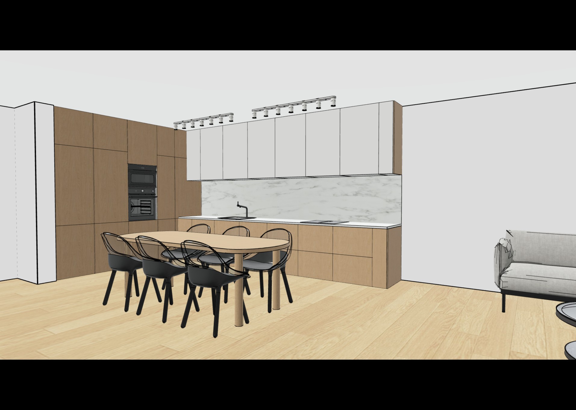 luxiury furniture scandinavian vibe with a touch of japandi please respect the gabarit of space that you ve been given add lightning and add accessories i want wow effect please put modern pendant above dinning table let colours be modest