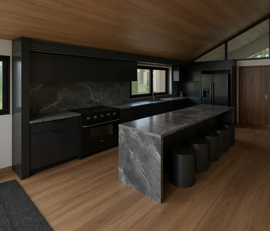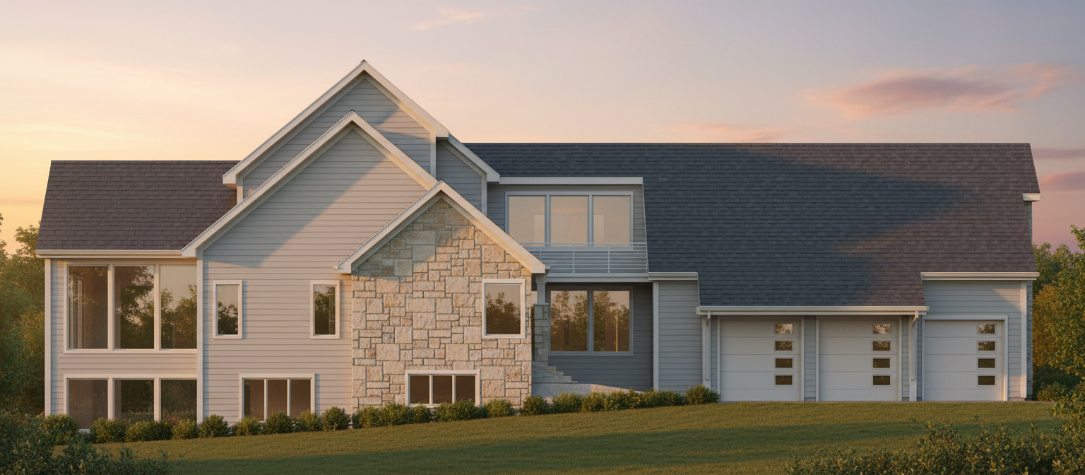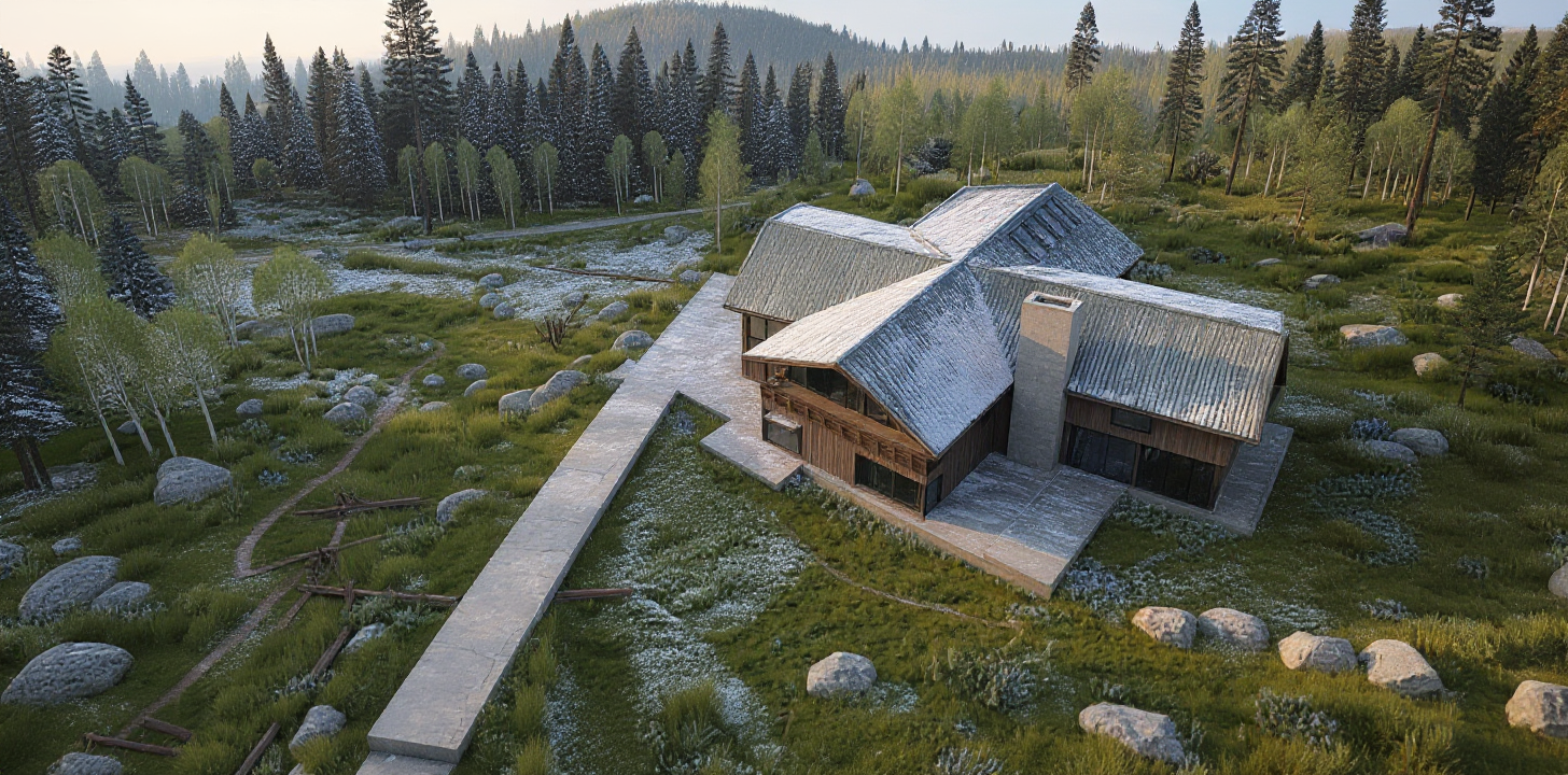 render a modern house with a sleek contemporary design the exterior features a mix of lp smartside and stone textures the lp smartside is a dark gray while the stone accents are a warm beige the windows are large and reflective framed with black trim the roof is black surround the house with towering white pines and oaks including blooming flowers in vibrant colors such as lavender and soft pink it is golden hour suggesting a serene sunset the overall atmosphere is peaceful and inviting enhanced by soft warm up lighting illuminating the exterior