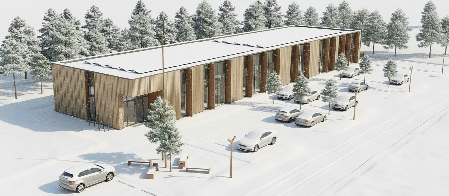 exterior shot do not change the photo and keep everything as shown only add 15 walking people on the sidewalks in the photos in the middle and on the left on the flagpole hang a non fluttering lithuanian flag architecture