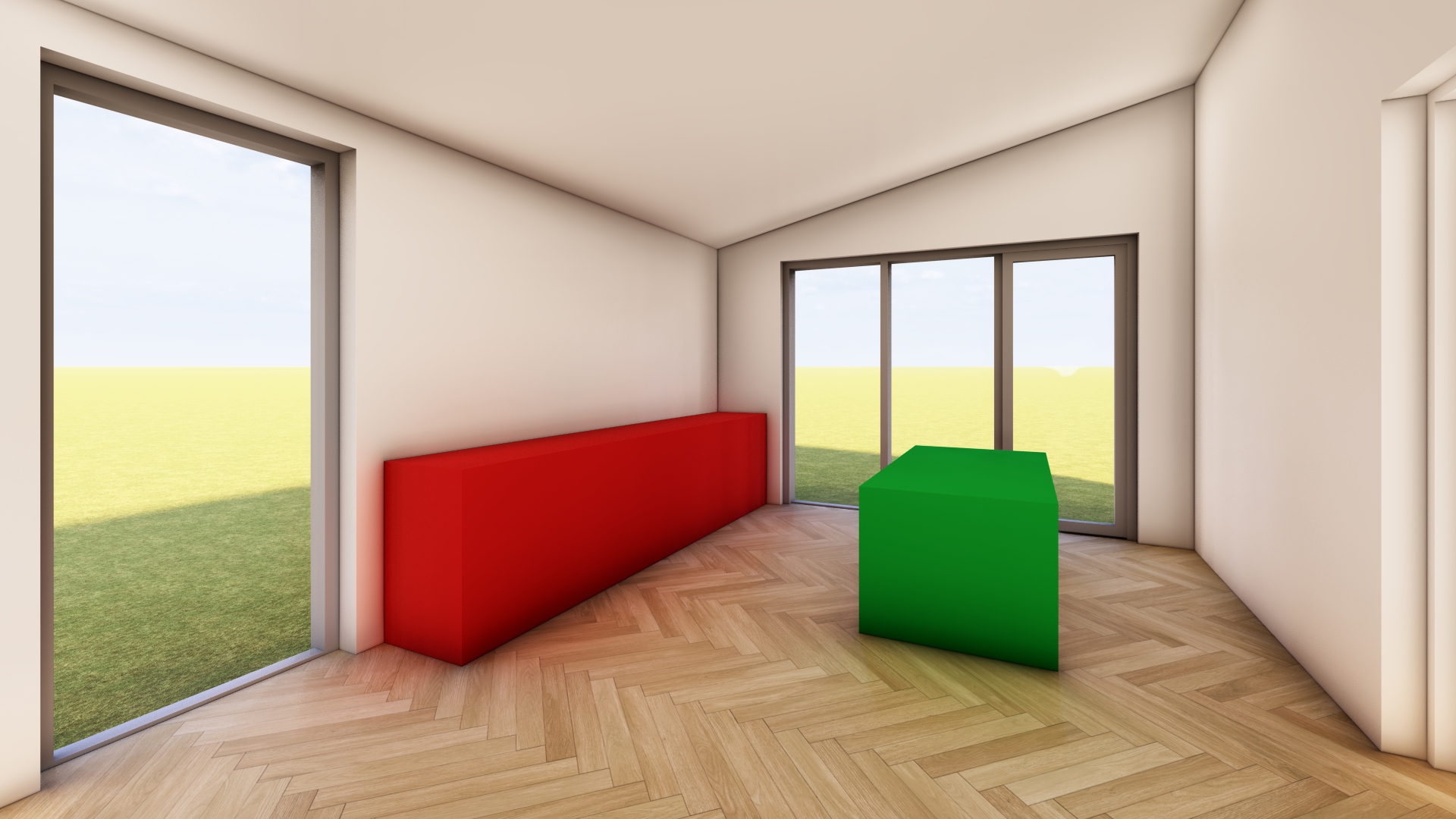 rode blok word een moderne keukenblok groene blok word een moderne eettafel met stoelen en hanglamp buiten veel bomen en natuur