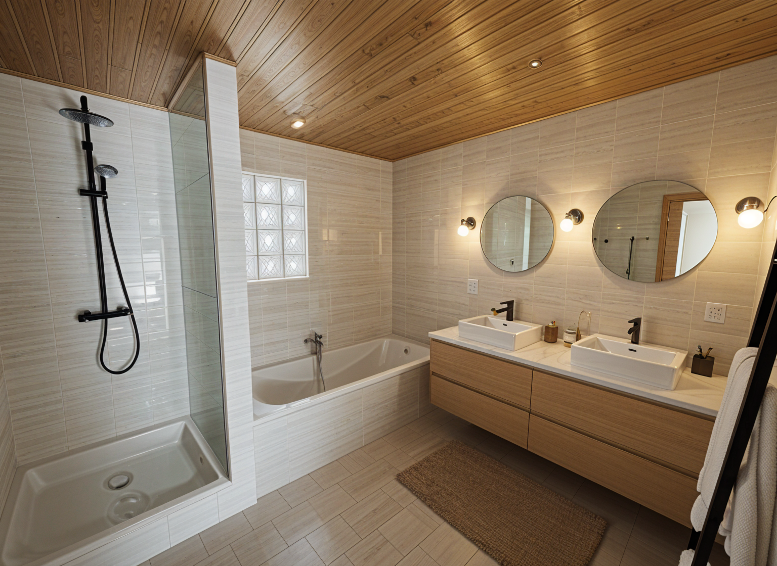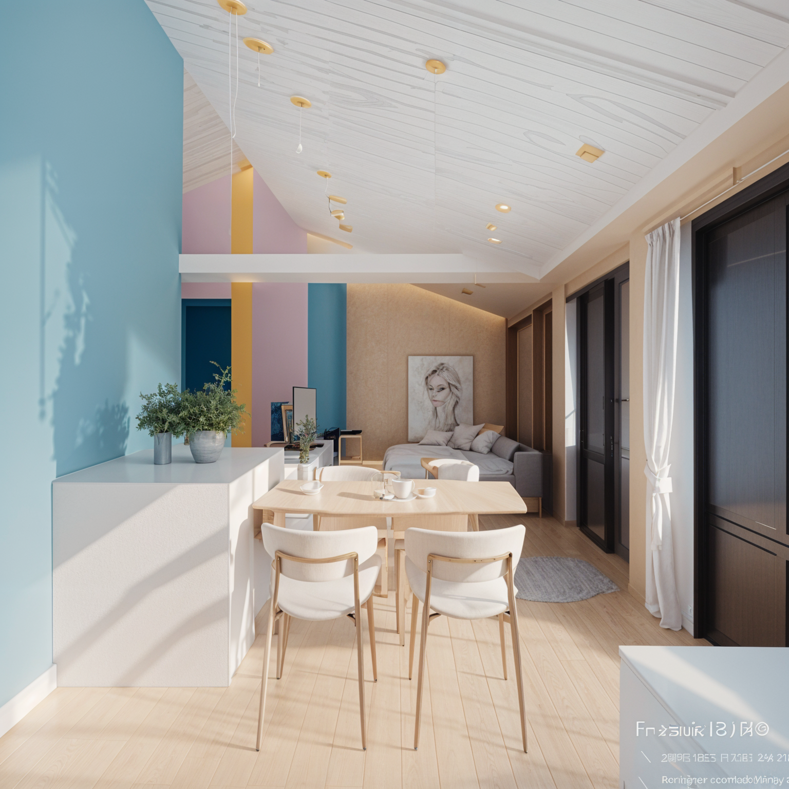 interior shot render the sketch to fotorealistic materials with soft basic colors and wood on the walls and most furniture and a pop of color in blue in the cushions
