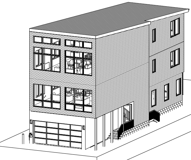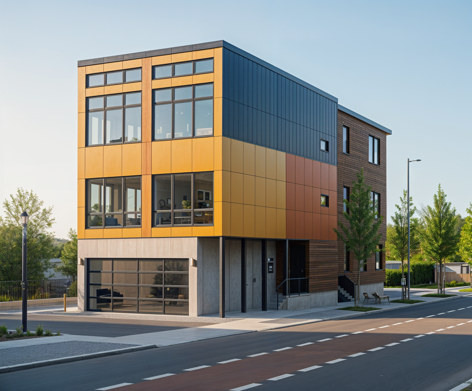 modernist exterior shot black pvc panels on front with horizontal black siding on the side and medium wood tone siding at the walkway to front door architecture