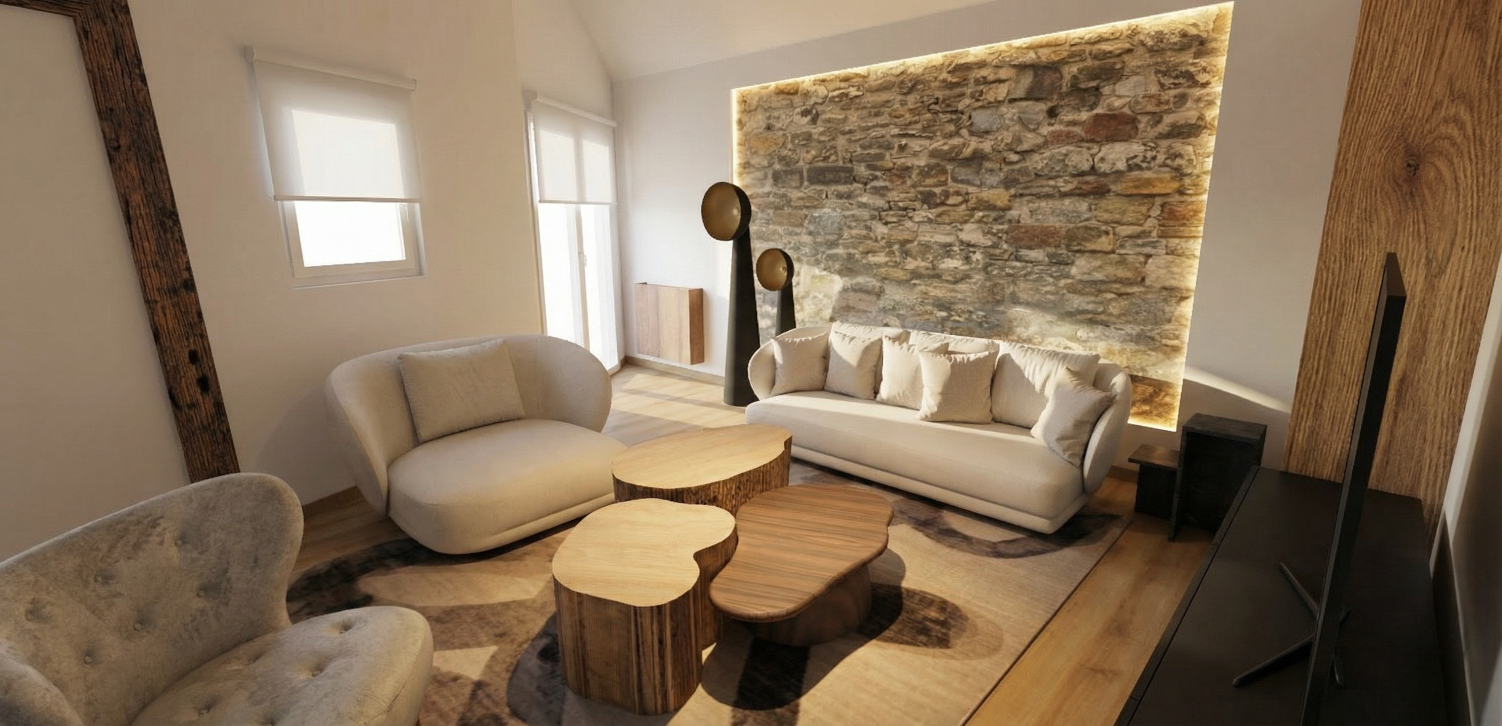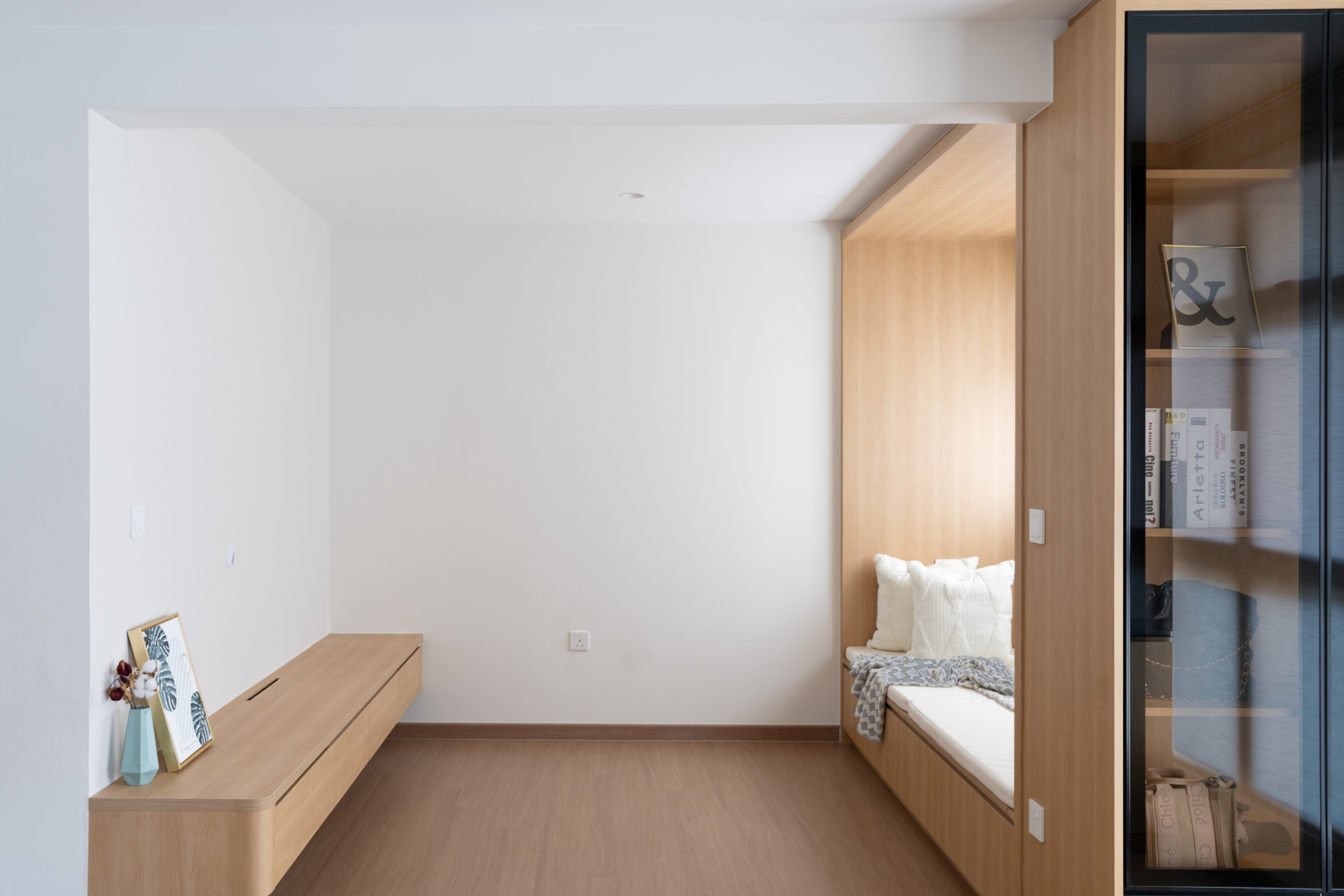 add furniture like artwork a tv coffee table and rug according to the muji contemporary design concept in the scene use the daybed in the scene in place of a sofa
