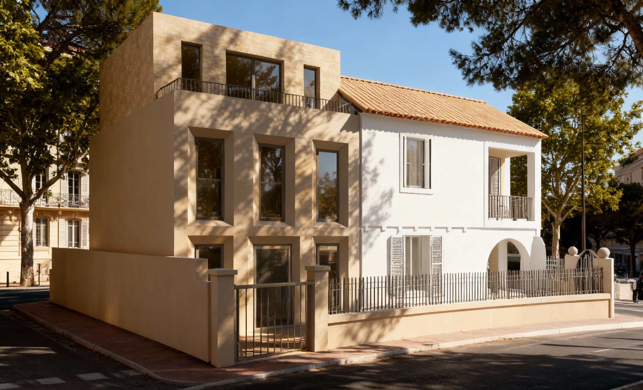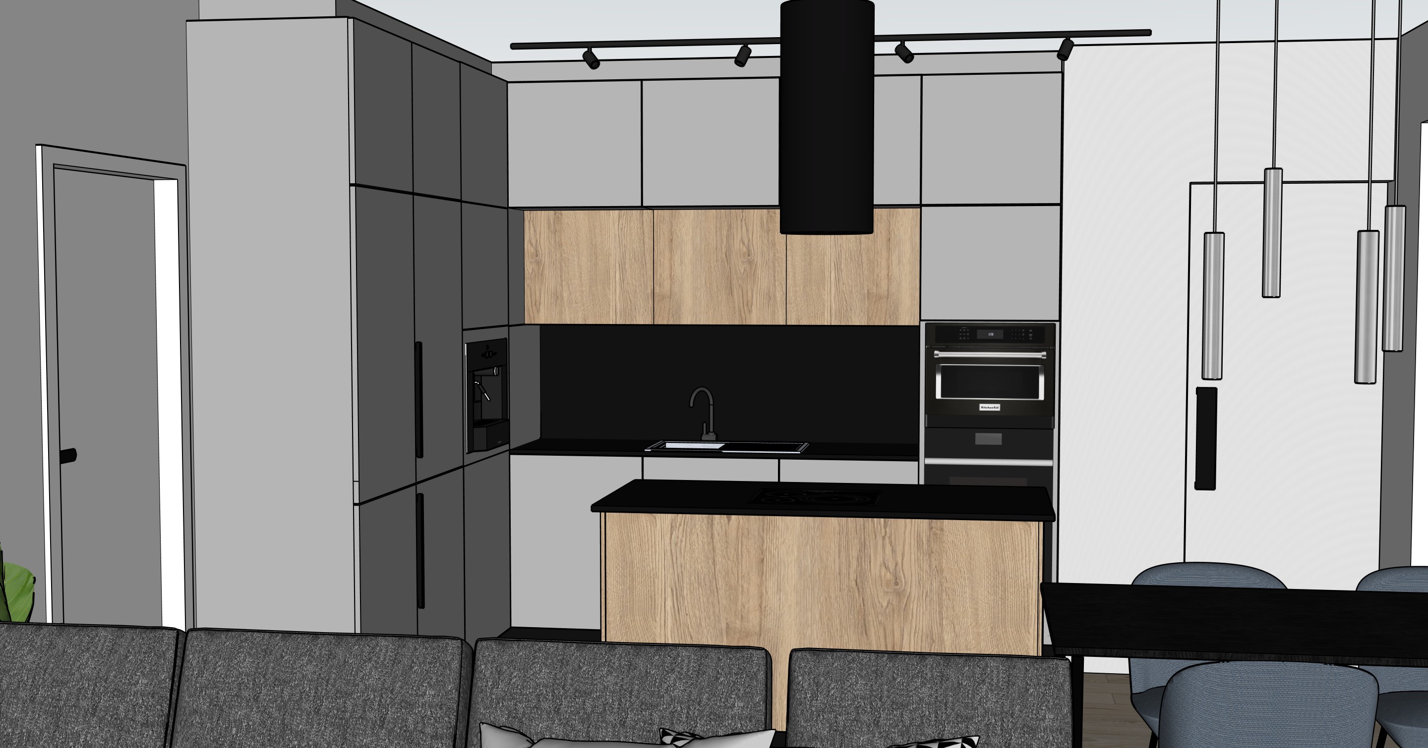 render a modern apartment interior with a minimalist design the living room features a sleek gray sectional front the walls are a soft gray gray cabinets with integrated black appliances and wood accents the black countertop and backsplash add a refined touch in the dining area a black dining table is surrounded by blue upholstered chairs the atmosphere is cozy with warm natural lighting and a sophisticated ambiance accentuated by dark wood flooring