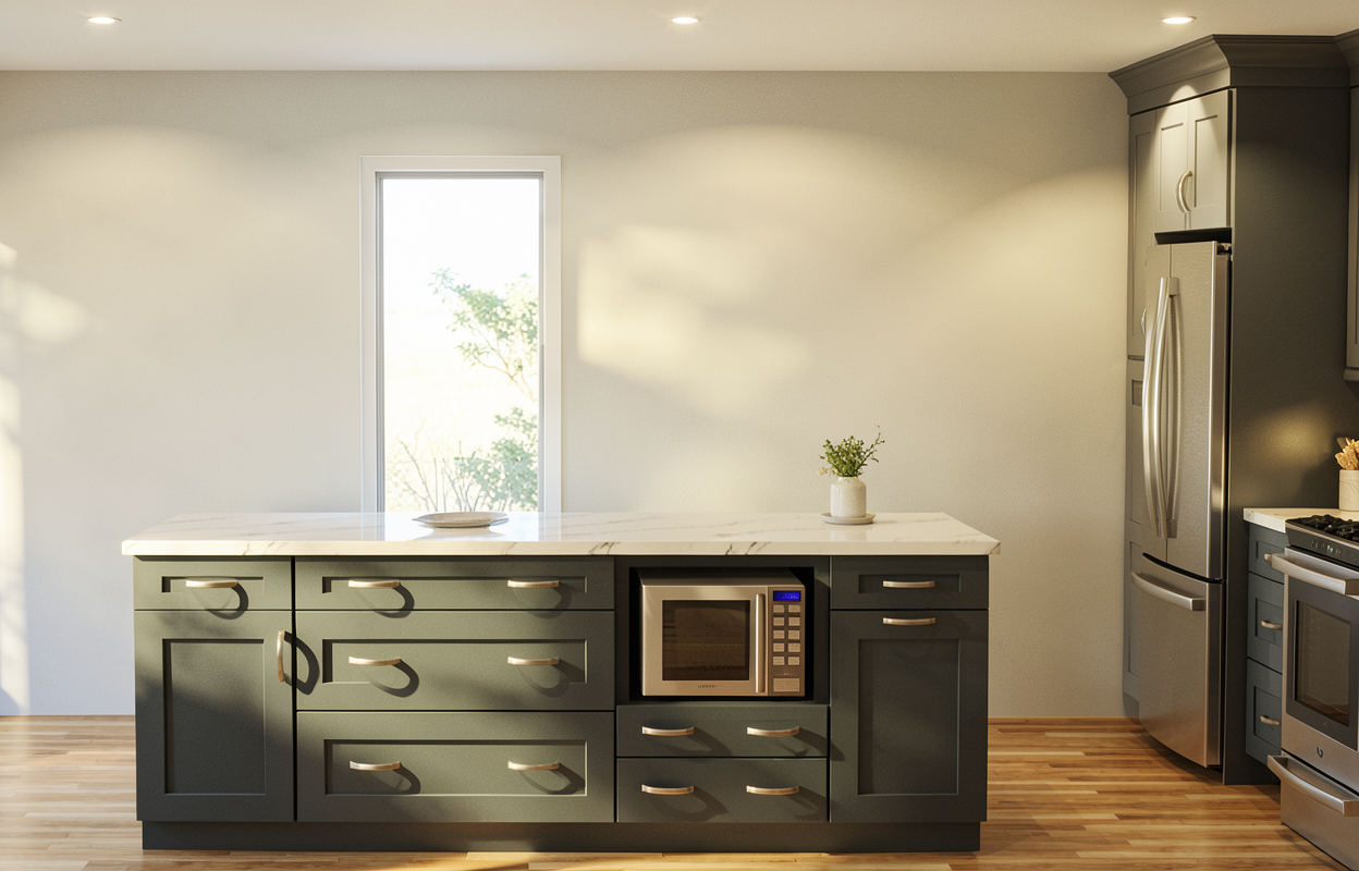 add a rug decor and window curtains transform this architectural interior design drawing into a photorealistic rendering maintain the exact layout dimensions and placement of all elements do not change materials colors or geometry additionally apply a very subtle hand drawn architectural sketch overlay faint pencil line edges around furniture silhouettes cabinetry and key architectural elements as if barely sketched over the photograph keep it extremely subtle the photorealistic image must remain fully dominant