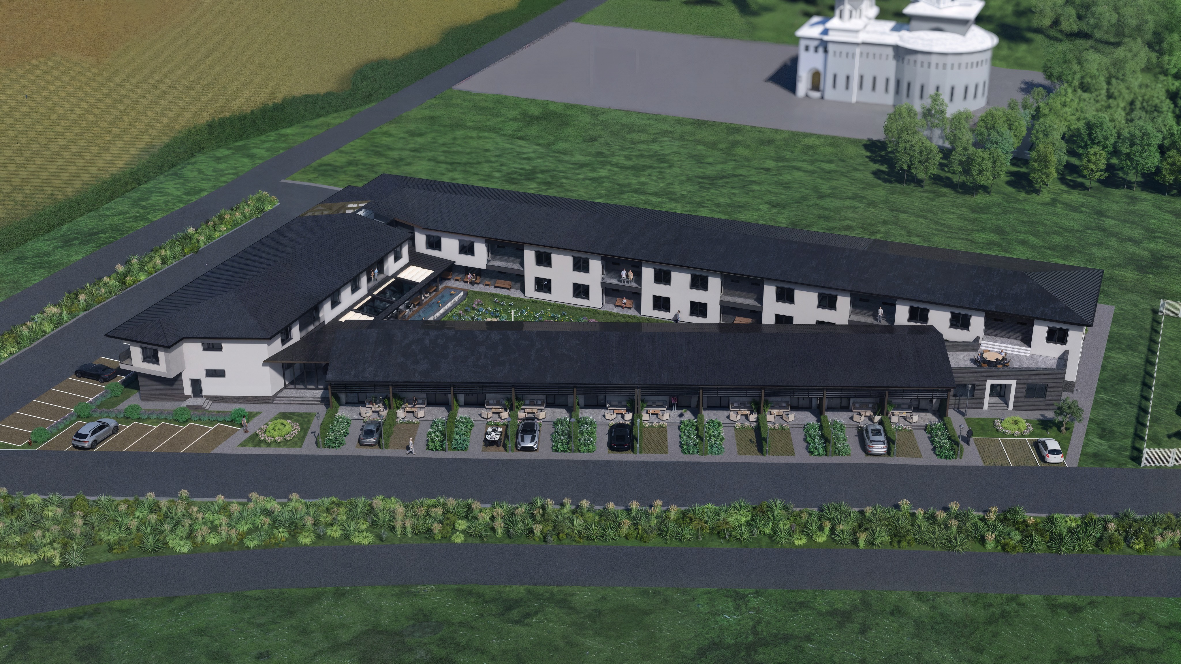 enhance lighting by slightly increasing overall brightness and exposure while preserving the warm sunset atmosphere soften shadows and reduce excessive darkness especially in shaded areas and on the ground maintain warm golden hour light on facades but balance it with more ambient light for better visibility increase midtone brightness to bring out details in vegetation pavement and building surfaces keep interior lighting visible and warm without overexposure preserve contrast but avoid overly dark areas maintain a clean high end architectural visualization style preserve geometry exactly