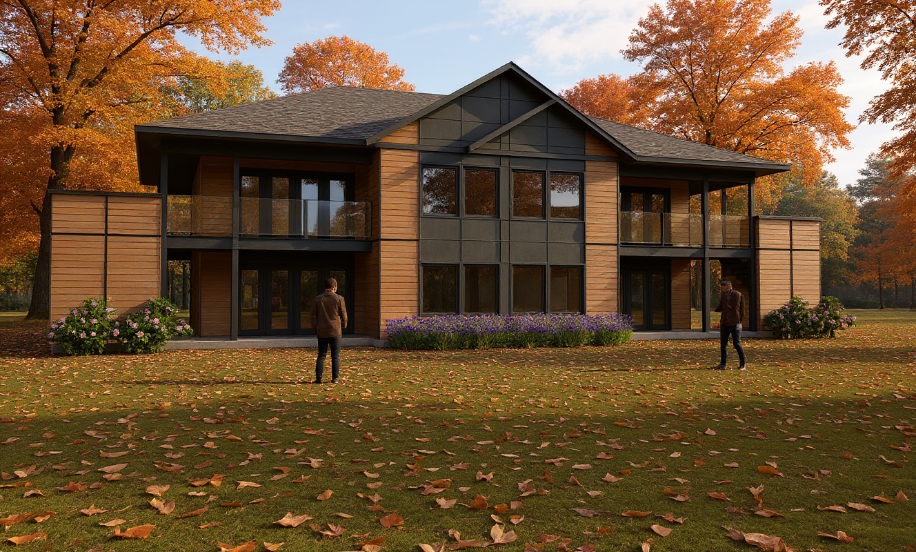 prairie style texas ranch land setting with foundation planting and wildflowers mottled brown roman brick bronze paint on doors windows fascia texas live cream colored window frames oak trees in yard taper walk up to front porch gravel drive to garage door no wall light by garage door texas red blue and yellow wild flowers in yard ramp sidewalk up to front porch