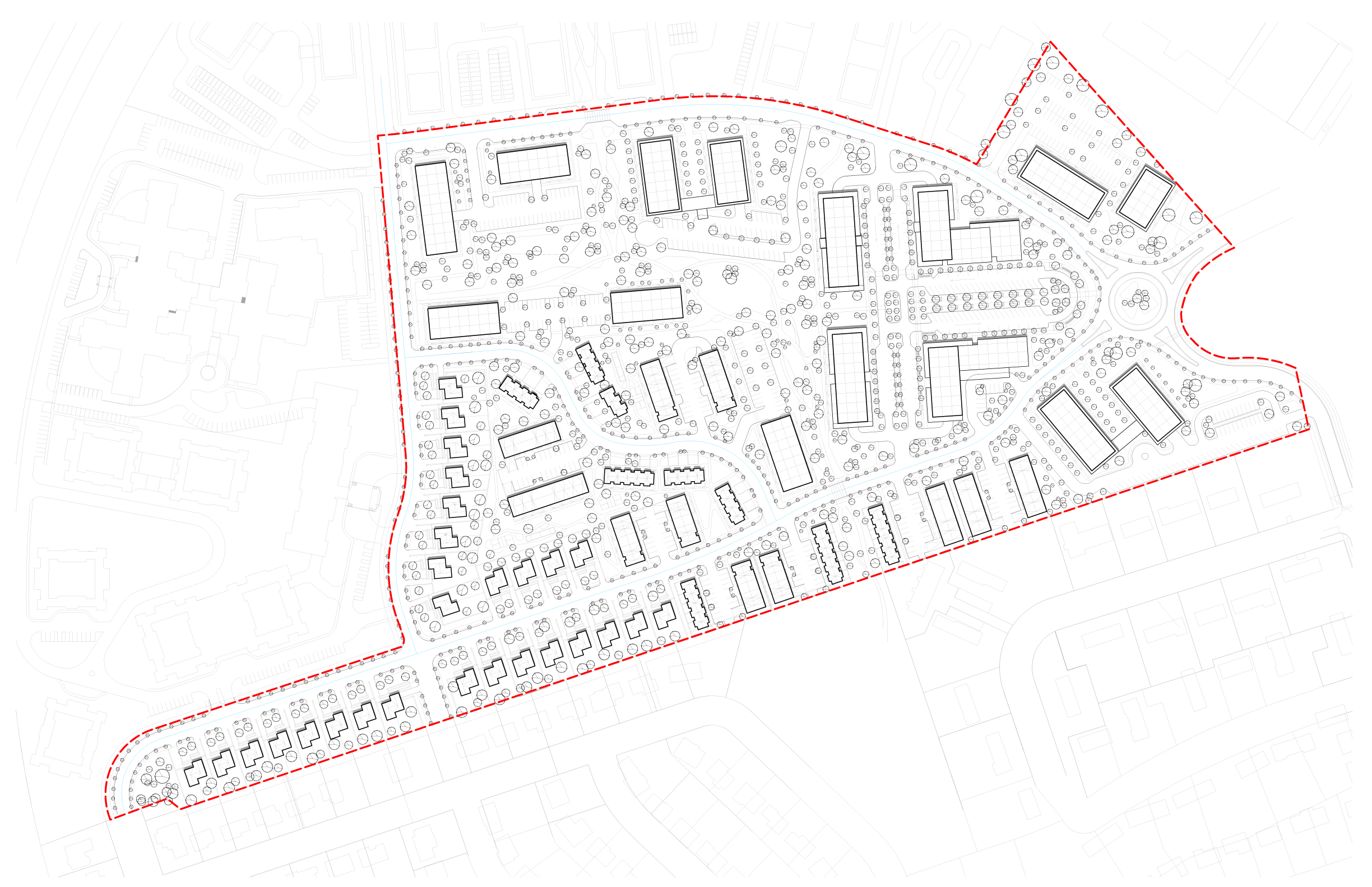 create a 3d aerial view of this development the style is a white clay model with trees in color